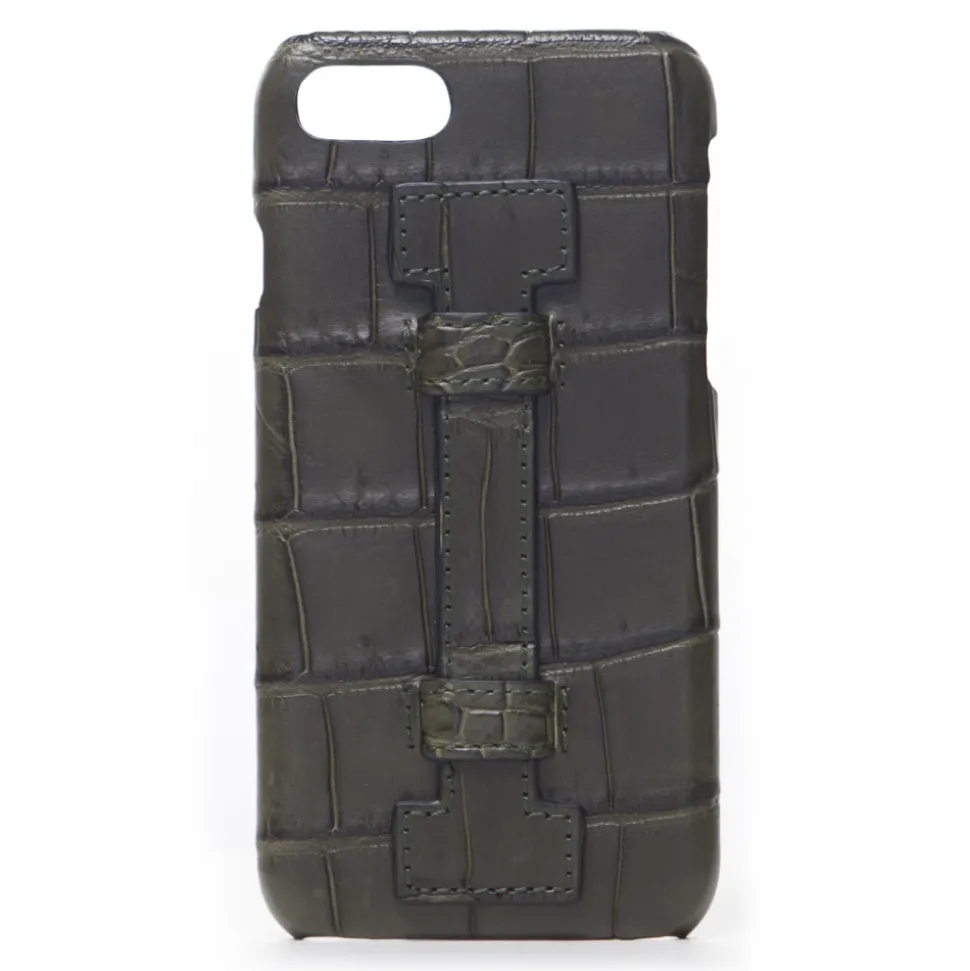 Handmade iPhone Case with finger handle realized with the best Italian crocodile leathers.