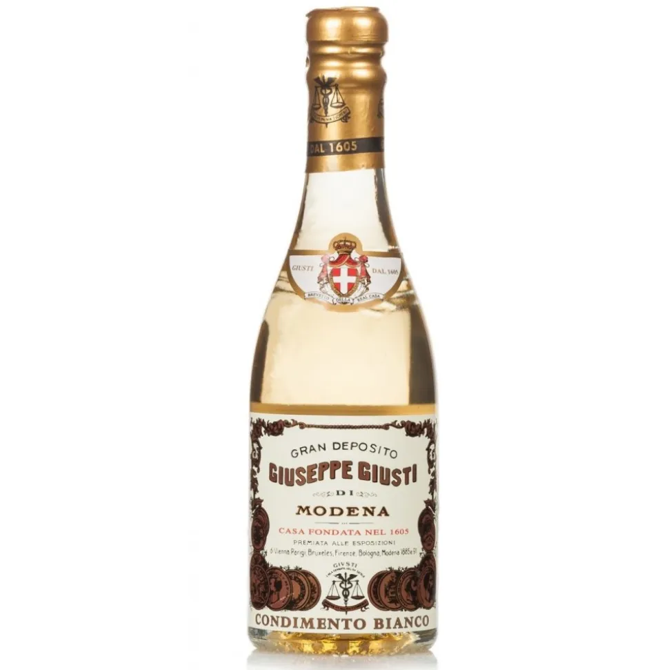 The White Giusti condiment is born from a soft pressing of Trebbiano grapes, from which a particularly sweet juice is obtained. This is then combined with high quality white vinegars and aged in french oak and ash wooden barrels. This process keeps all the fruity and floral aromas of the grapes, creating a very pleasant condiment, thanks to the contrast of its low acidity and the notes of sweet, yellow fruits and dried citrus. Fresh and balanced, it is extremely versatile and easy to use.