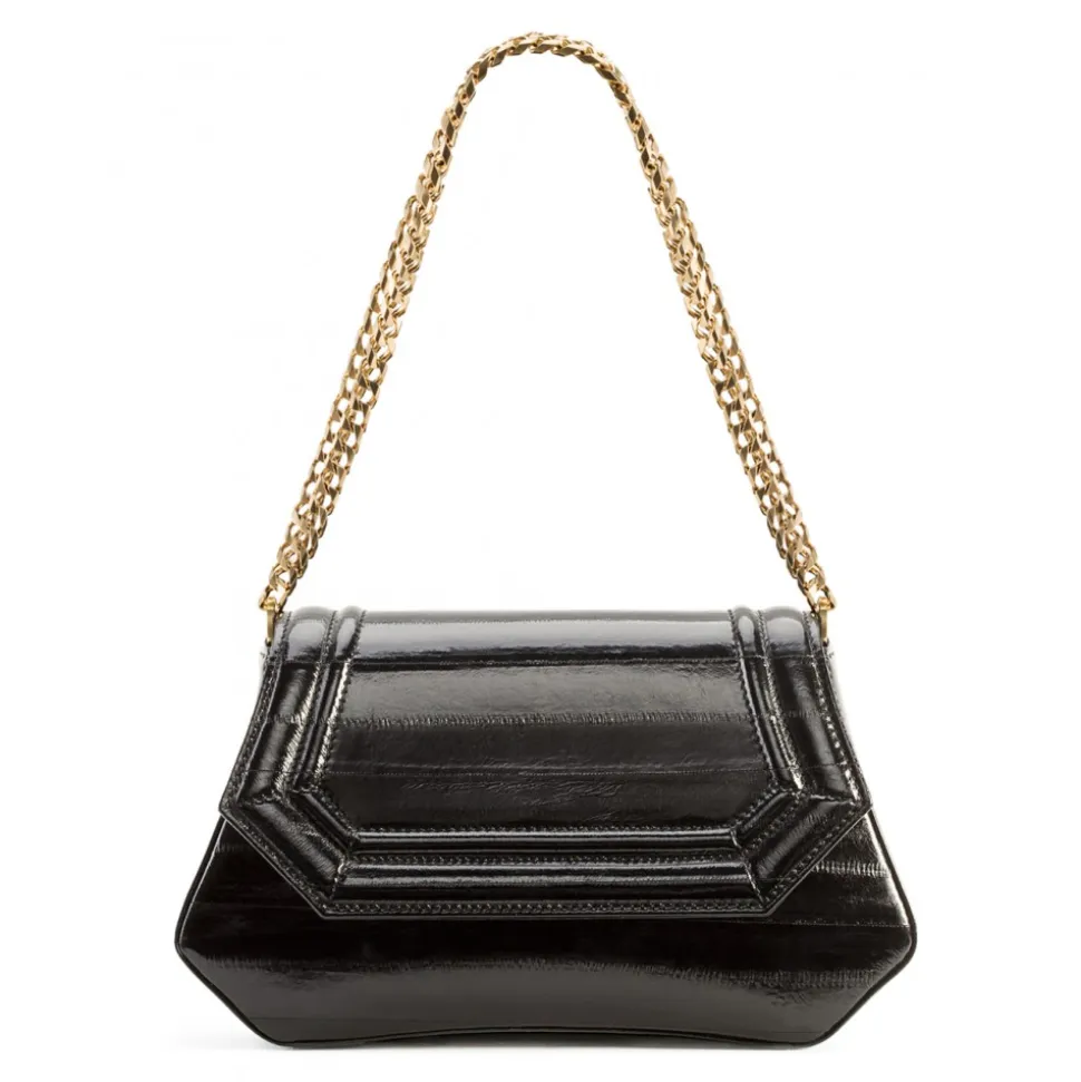For ultimate luxury the essential bag is the one and only, Etoile. Perfect for special occasions or making an fashionable entrance, this timeless piece exudes elegance from every detail. Hand-crafted from a stunning red eel leather and adorned with a pale gold, double chain strap. This one-of-a-kind accessory drapes beautifully over your shoulder or wear it as a clutch. With its unique shape and sleek characteristics the Etoile will be your next wardrobe staple.