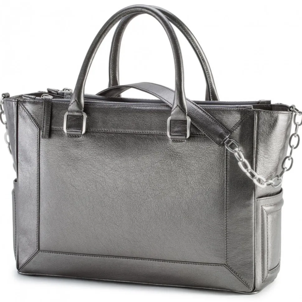 A roomier version from the signature LadyLike collection that combines beauty with incredibly practical features. This LadyLike M boasts a smooth onyx calfskin. Flaunting an even more spacious interior, this style is perfect to carry work documents or weekend items. Featuring a magnetic flap closure and equipped with large side pockets to make sure all of your favorite things are zipped away. Attach the convenient leather and chain strap to wear on the shoulder or cross body for the woman on-the-go.