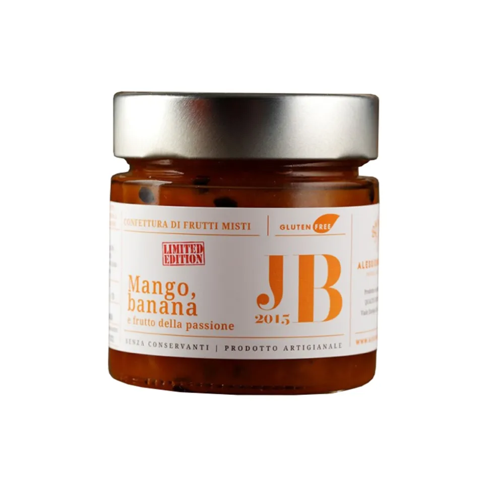 Very special jam with delicious chunky mangoes, bananas and passion fruit. An explosion of aromas and flavors. Dedicated to my youngest son Jacopo Brusadin. Born 5 years ago as a wedding favor for her baptism, it is no longer out of production. Excellent as a garnish for mousse and cheesecakes, but also excellent on toast.