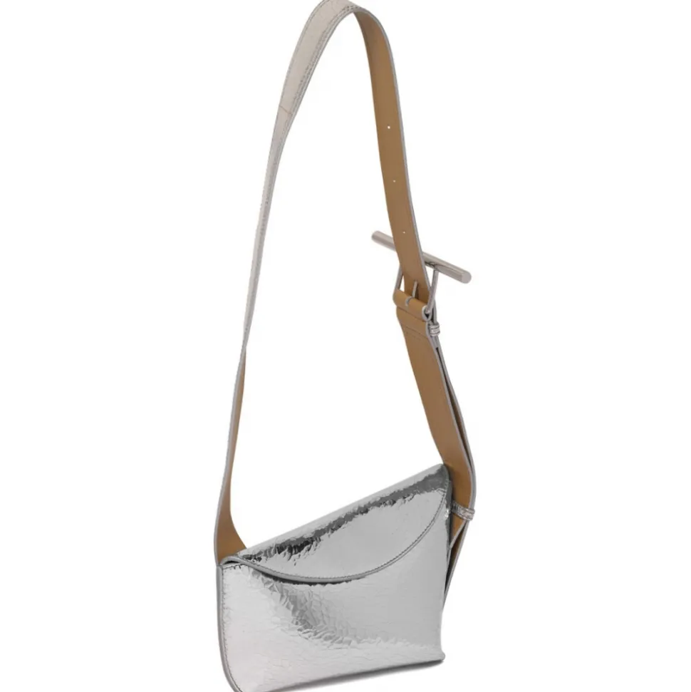 Alexander McQueen Silver Asymmetrical Bag. Silver sling T-bar bag, asymmetrical model handcrafted from a single piece of beige suede calfskin. Crackle-effect metallic silver coating. Can be worn cross-body thanks to the adjustable leather shoulder strap. Iconic oversized T-buckle in silver metal with engraved McQueen logo.