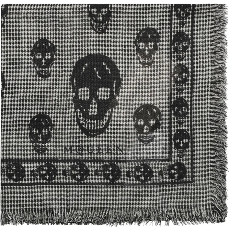 Alexander Mcqueen Grey Skull Print Scarf. Grey wool scarf, houndstooth pattern, square body, frayed edge.