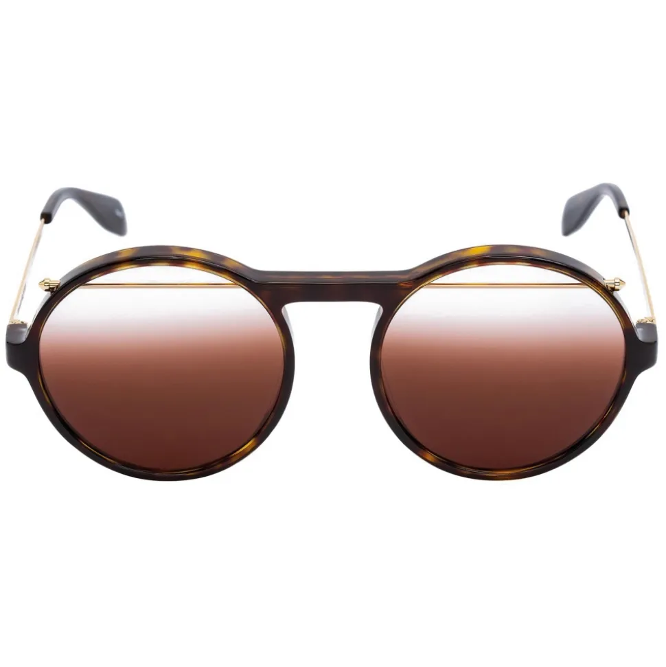 Havana acetate round sunglasses are fitted with brown gradient lenses, featuring a piercing bar running through the front of the frame. The sunglasses have fine metallic temples, which are finished with the Alexander McQueen signature engraved tone on tone.
