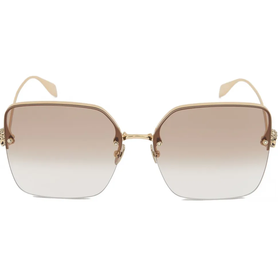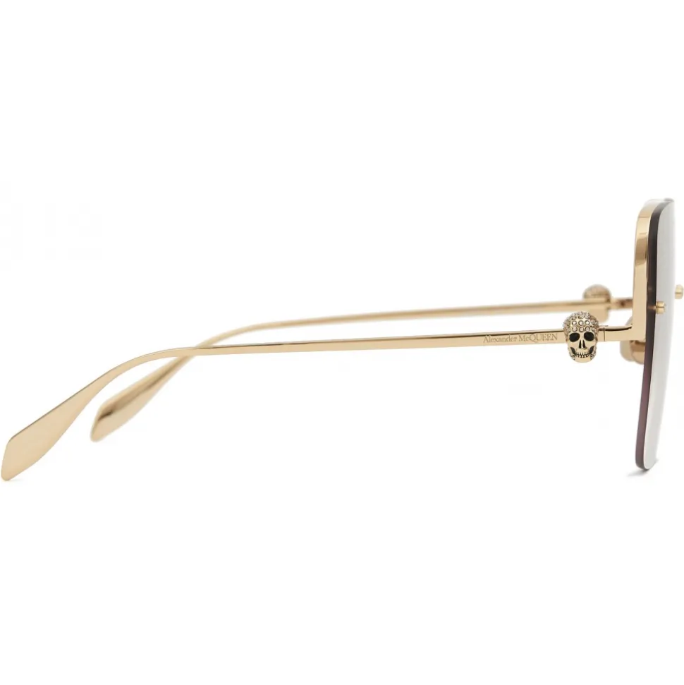 Shiny antique gold metal sunglasses are fitted with brown gradient lenses, inserted in a oversize rimless square construction. The lenses are fixed with studs and Swarovski crystals. The sunglasses have fine metallic temples, finished with crystal skull motifs and the Alexander McQueen signature engraved tone on tone.