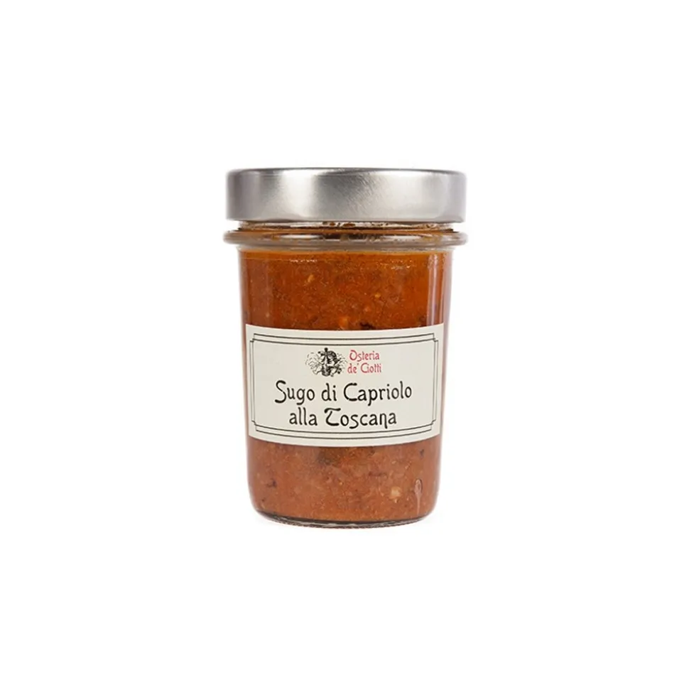 Ingredients: Roe deer meat (44%), tuscan organic tomato Tuscan (26%), onions (12%), carrots (6%), Italian extra virgin olive oil (6%), pork bacon (pork, salt, pepper, dextrose, sucrose, potassium nitrate, sodium nitrite, ascorbic acid, natural flavors) (4%), bay leaves, berries juniper, red wine (contains sulfites), salt and pepper.