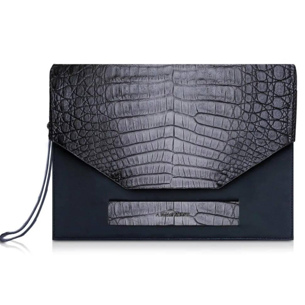 Handmade leather pete clutch bag in caimanĀ and cowhide leather lining made in Italy.