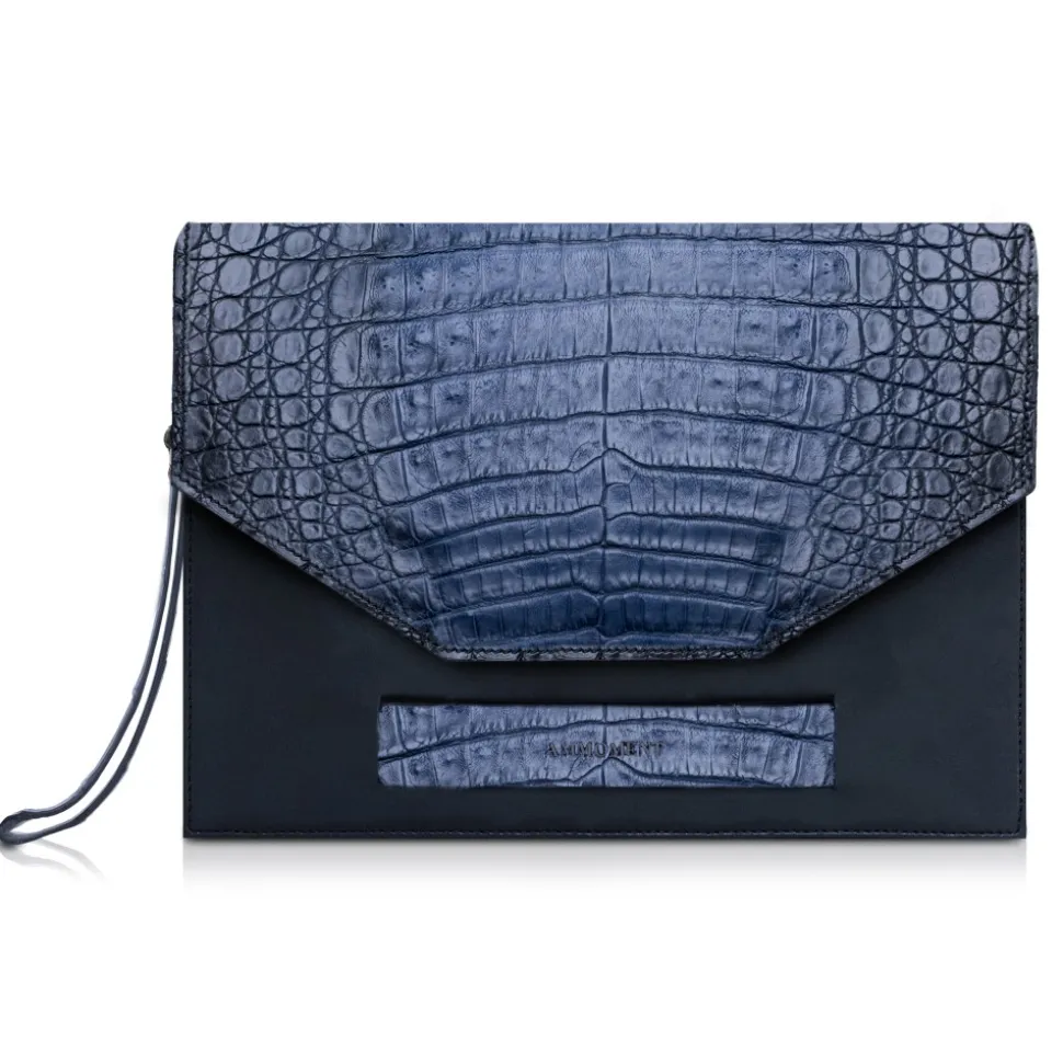 Handmade leather pete clutch bag in caimanĀ and cowhide leather lining made in Italy.
