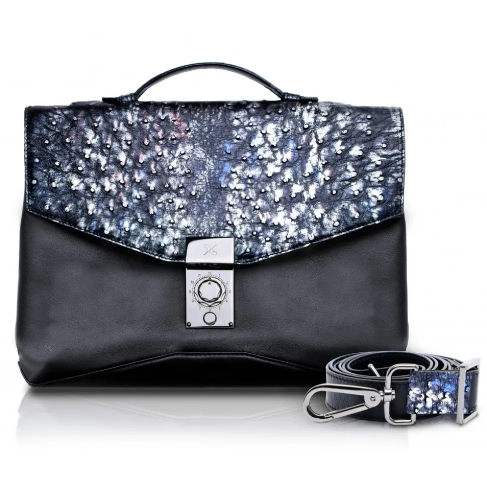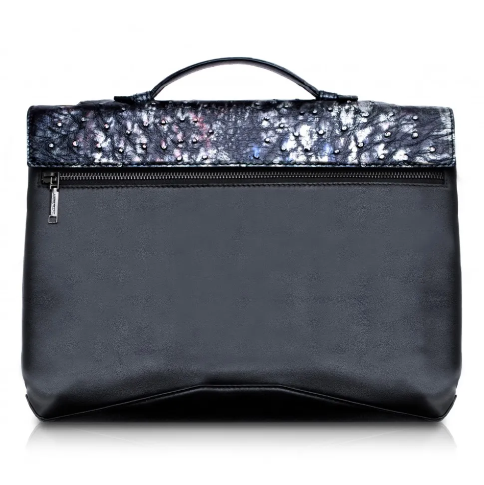 Handmade leather Orion briefcase in ostrich leather and cowhide made in Italy. The Ostrich skin is hand painted in Tahitian Pearl Black colour, which is a very rare and unique colour.