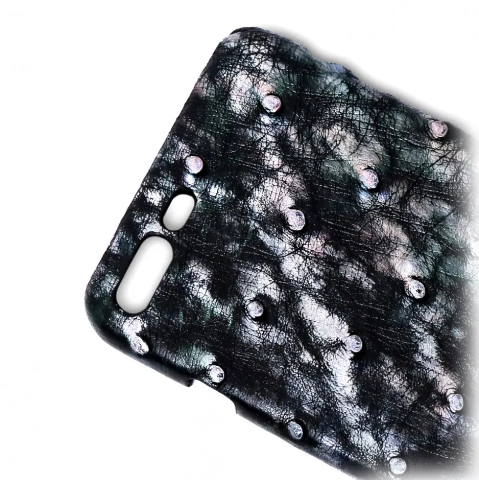 Handmade iPhone cover in ostrich leather made in Italy. The Ostrich skin is hand painted in Tahitian Pearl Black colour, which is a very rare and unique colour.