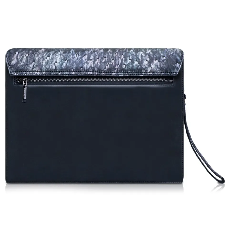 Handmade leather pete clutch in ostrich leather and cowhide made in Italy. The Ostrich skin is hand painted in Tahitian Pearl Black colour, which is a very rare and unique colour.