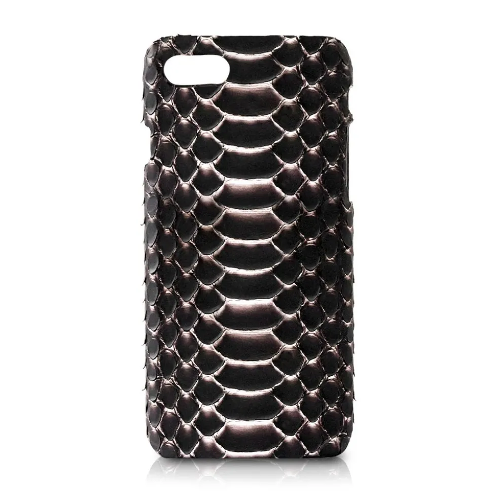 Handmade iPhone cover in python leather made in Italy. The python skin is beautifully tinted in shades of metallic rose gold at the rim of the python scales.