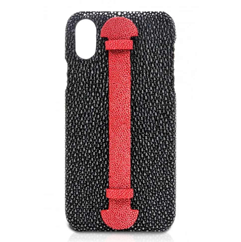 Handmade iPhone cover in stingray leather made in Italy. It has a finger holder that allows you to use your phone with one hand only without dropping it.