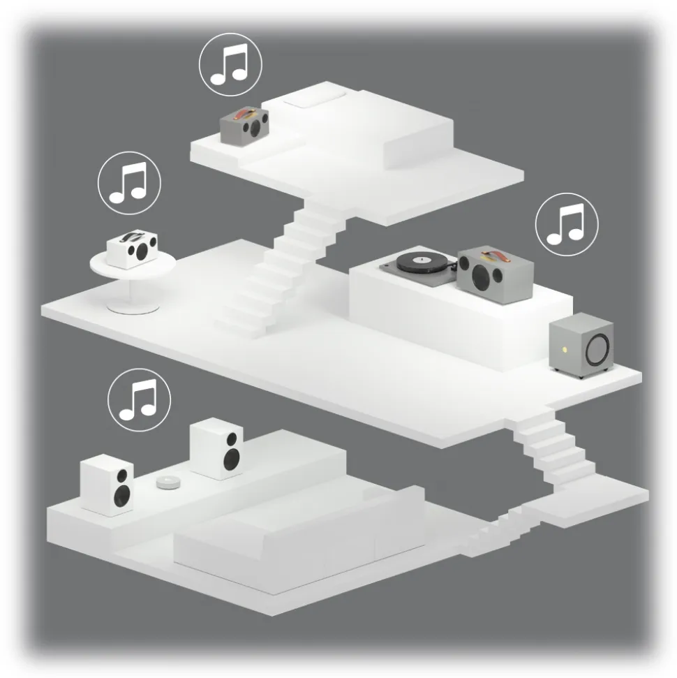 Have a speaker in every room and play to one or all at the same time. Everybody can play their personal music on which ever speaker they want. Play from internet streaming services, from a computer or NAS in your network, or music on your phone.