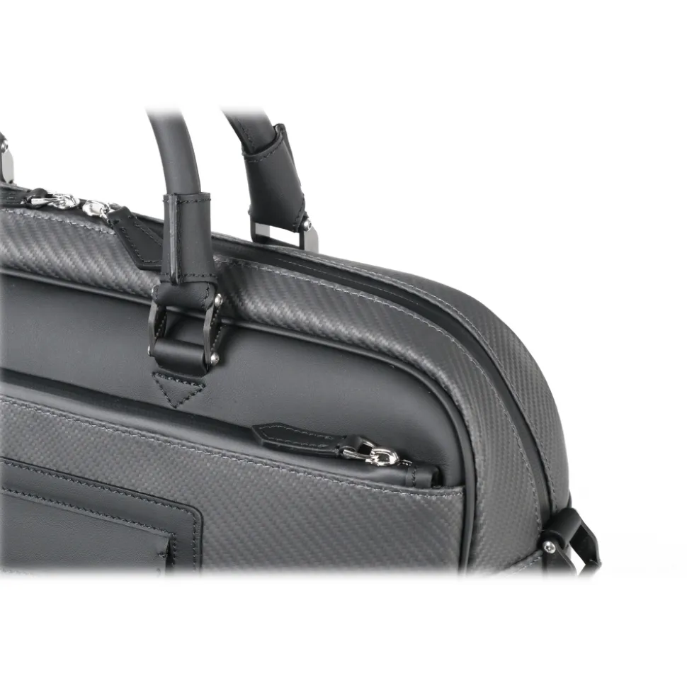 Avvenice Voyage Bag in carbon fiber and caved leather. Naturally elegant, it boasts a unique style, perfect for any destination or meeting. Finished in the highest quality smooth leather, this accessory with extraordinary capacity combines luxury and practicality.