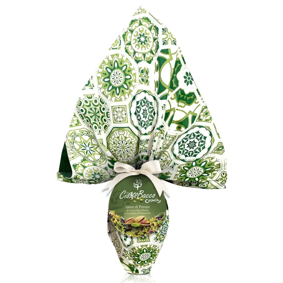 A sober and elegant packaging makes the white chocolate egg and pistachio grains a beautiful gift to celebrate Easter.