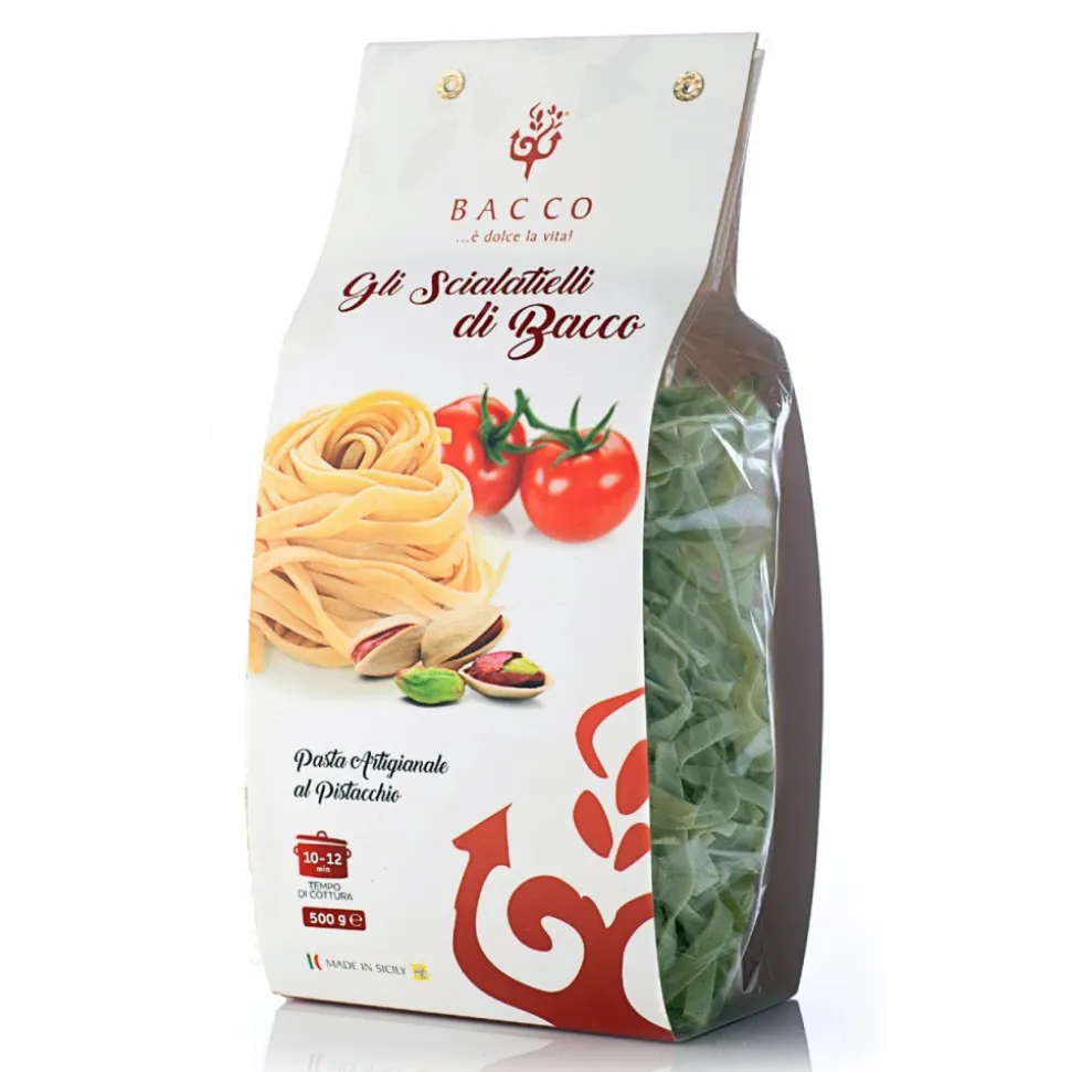 Southern Italy typical dried pasta, the Scialatielli. The durum capable of very high quality meets the pistachio flour for a unique and distinctive taste. Dried at low temperatures for 70 hours which gives to the product the typical roughness of hand-made pasta. 500g package.