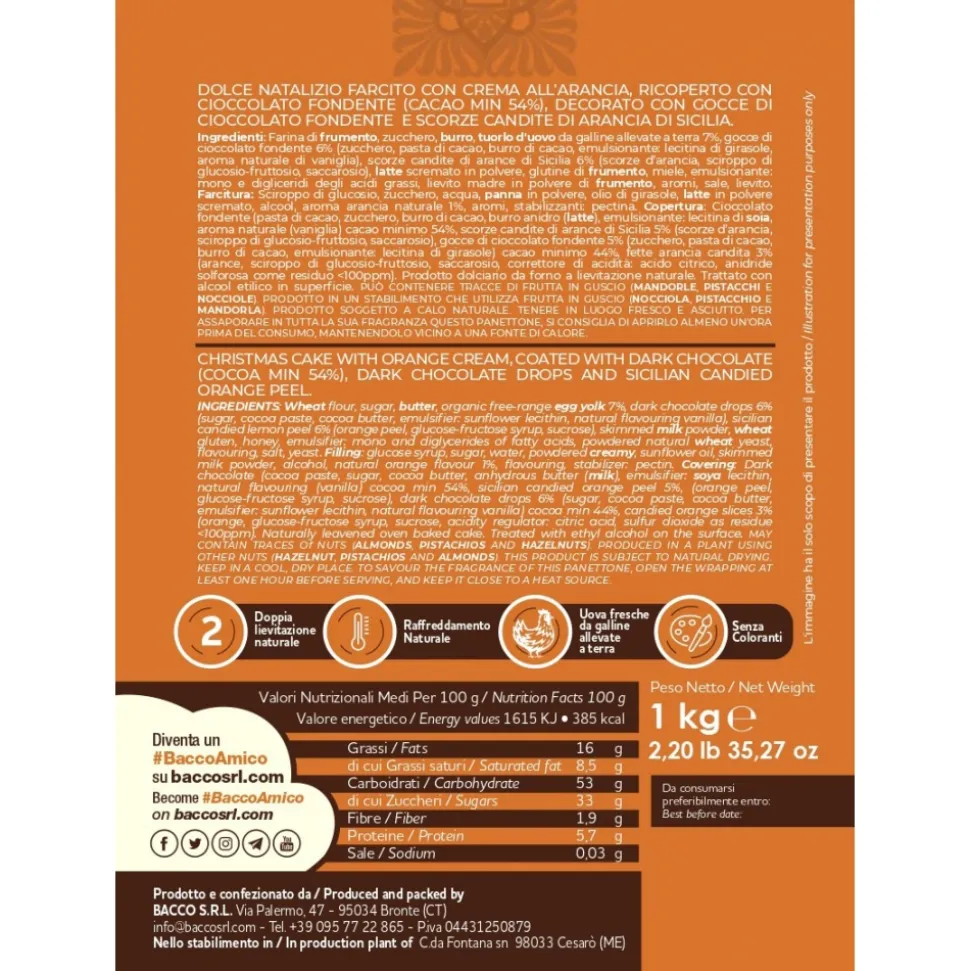 Sicilian Oranges filled with 200 g of orange flavored cream, covered with dark chocolate (54%), slices and candied peel of Sicilian oranges, it has a soft dough enriched inside with Sicilian candied orange cubes and dark chocolate chips.