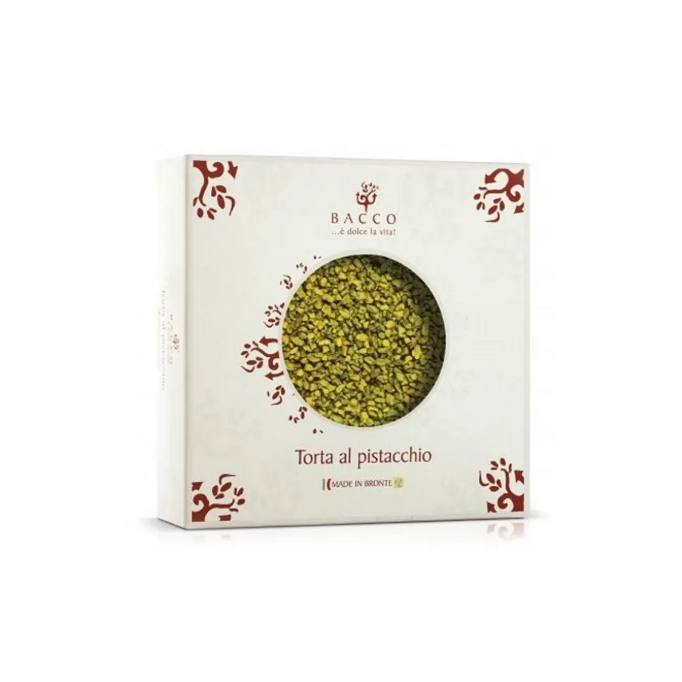 A soft disk of sponge cake, filled with a layer of sweet pistachio 30 % cream and entirely covered with pistachio flour, 500-gram weighing. Recommended after dinner for an evening with friends or in special occasions, with an elegant and refined packaging and an intense taste.