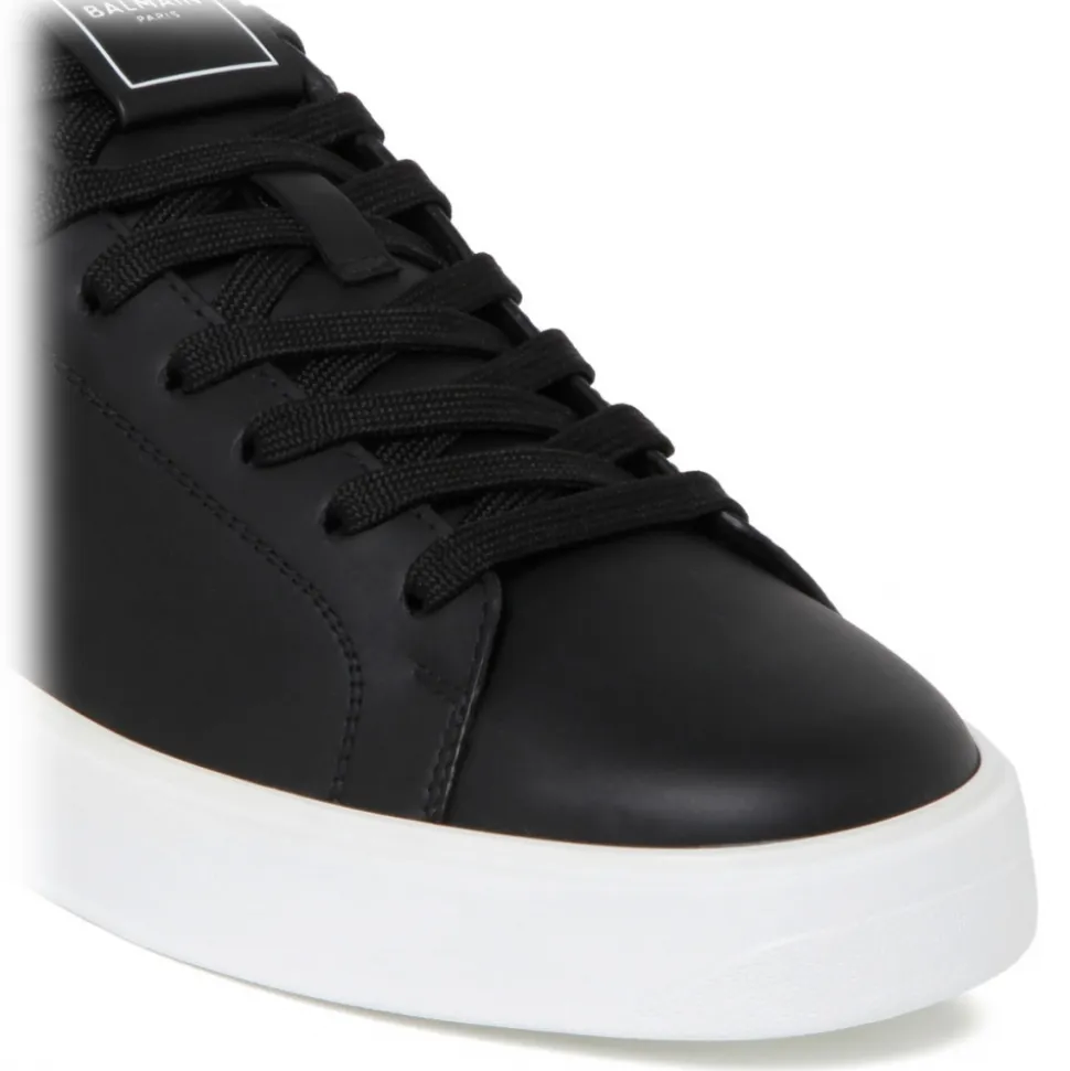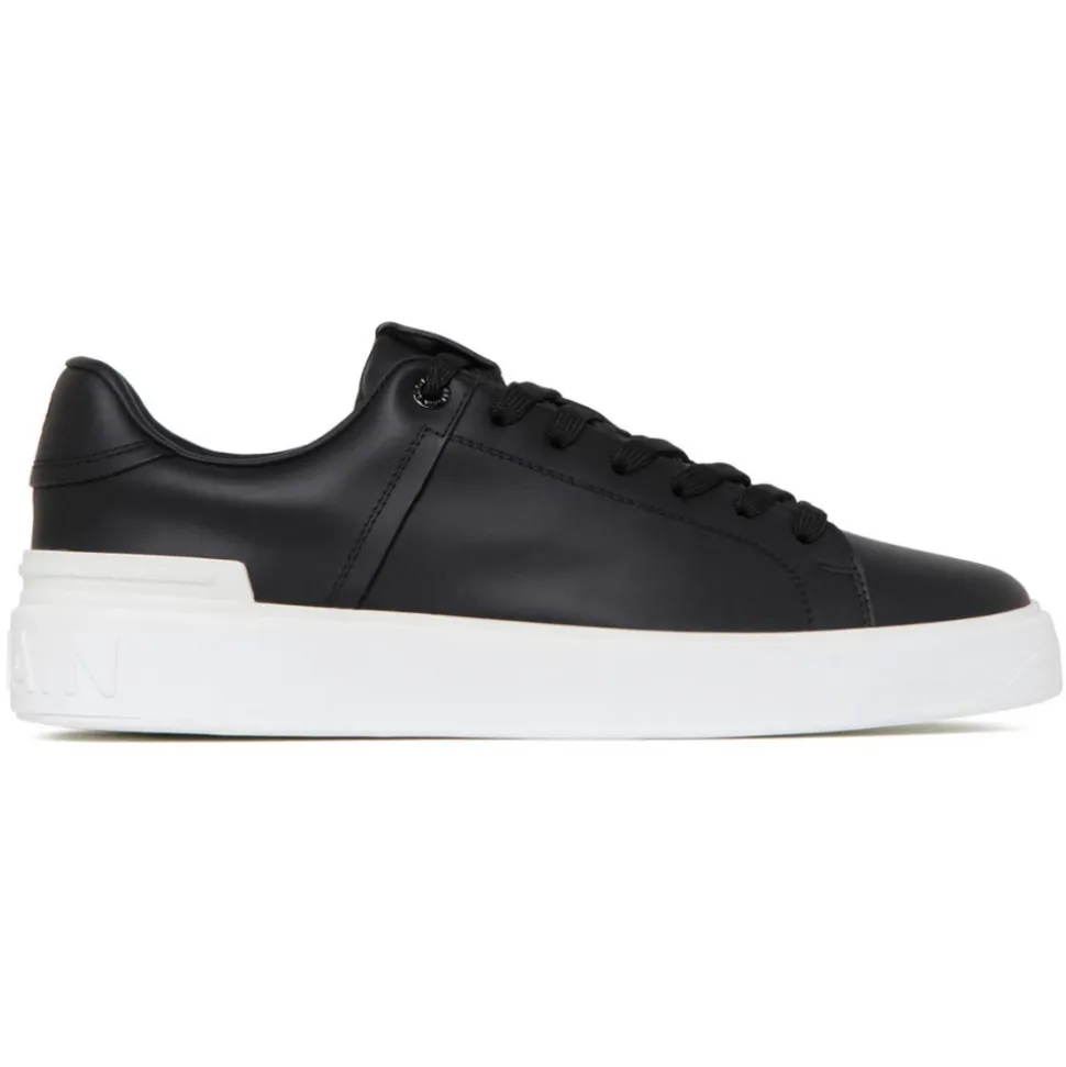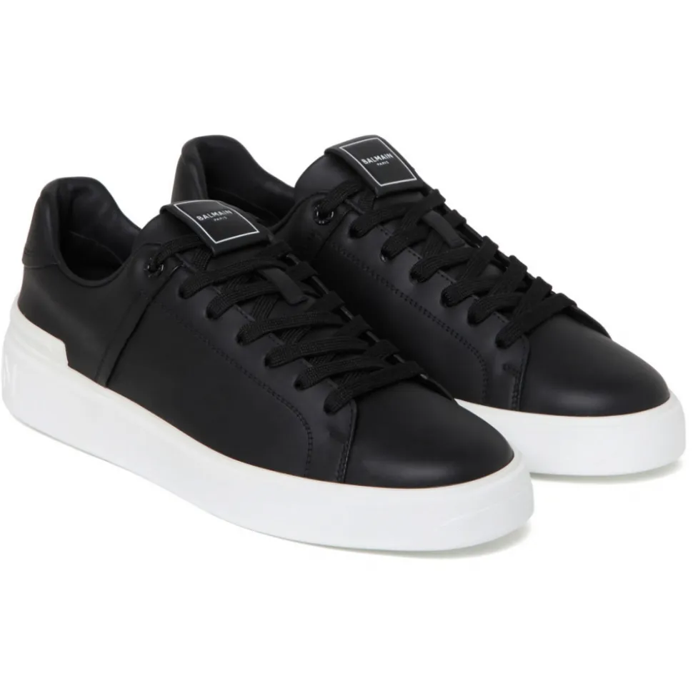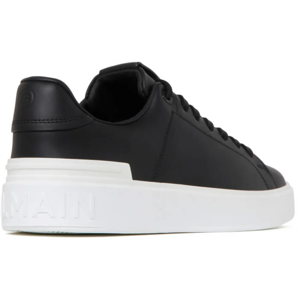 Balmain Black B-Court Sneakers. Black calf leather sneakers, laces on top, insert with printed white Balmain monogram, TPU sole with tone on tone embossed Balmain logo.