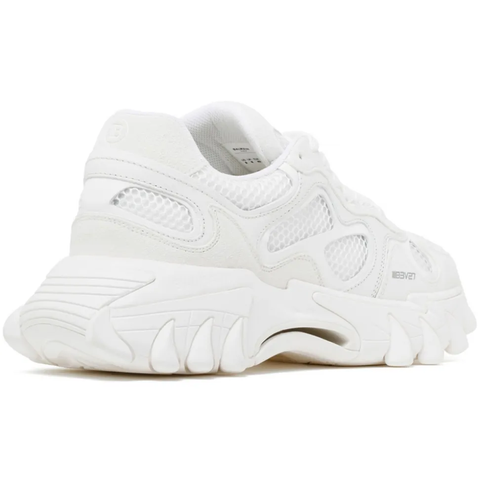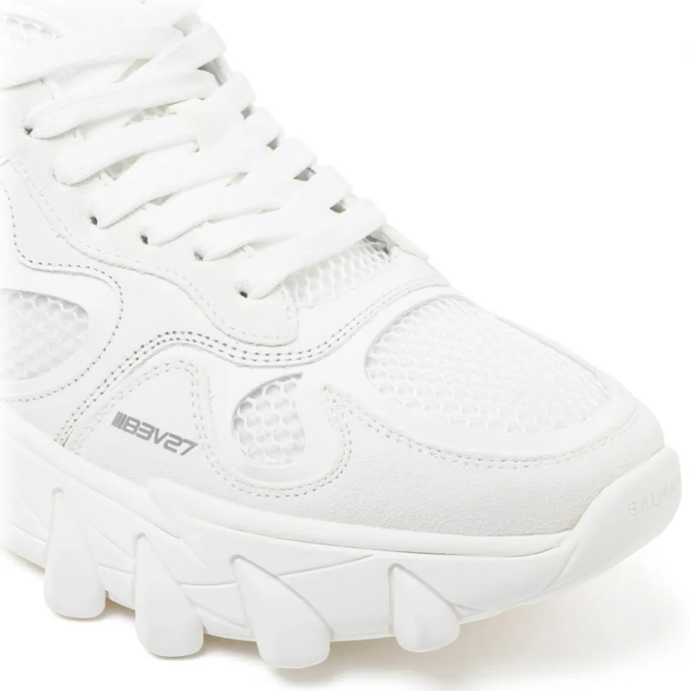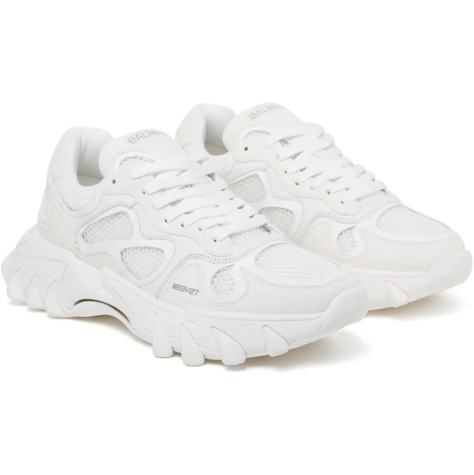 Balmain White Calf Leather Sneakers. White calf leather sneakers, front lace up fastening, logo embroidered tongue, round toe, smooth grain, panelled design, mesh detailing and chunky rubber sole.