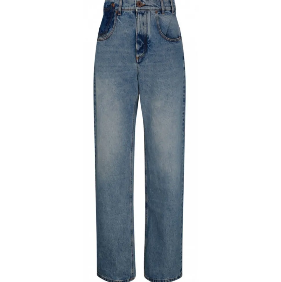 Balmain Light Blue Cotton Wide Leg Jeans. Light blue cotton jeans, high waist, belt loops, front button and zip fastening, logo plaque, contrasting pockets, rear patch pocket, wide leg and long length.