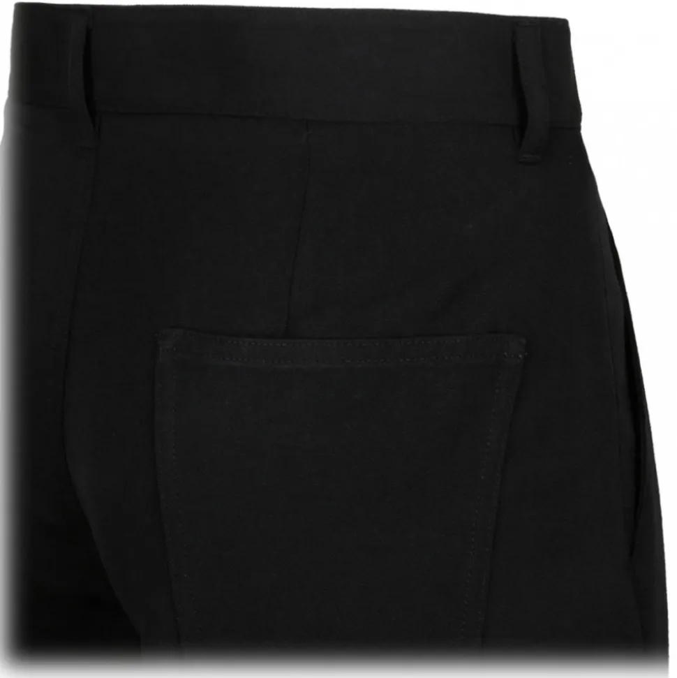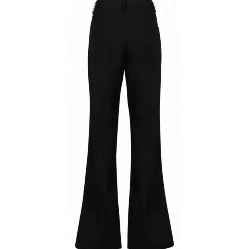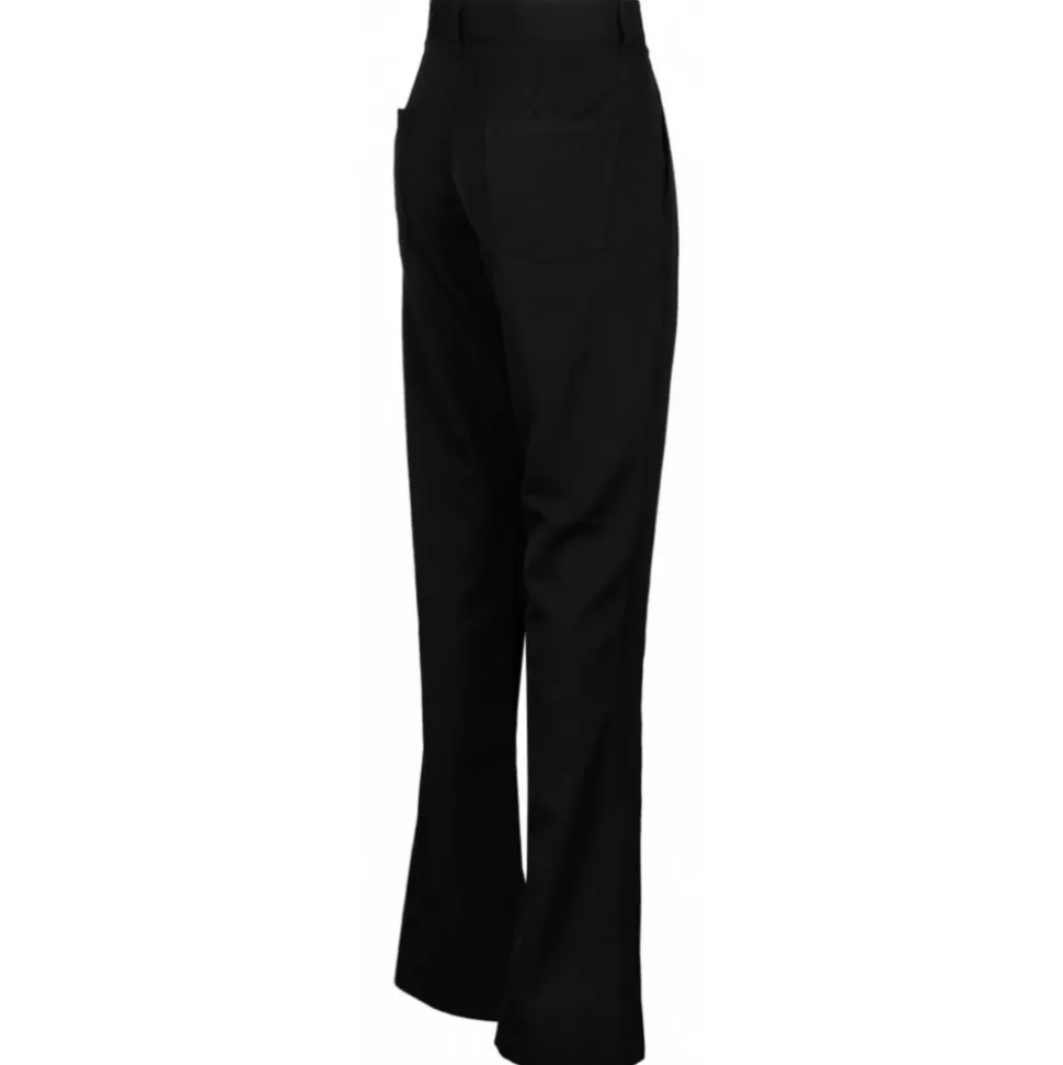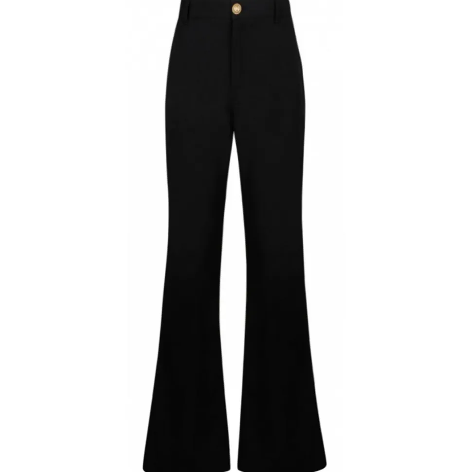 Balmain Black Crepe Trousers. Black virgin wool trousers, slightly flared bootcut fit, fastening with Signature Lion golden metal zip and button. Two slanted pockets, two patch pockets at the back.