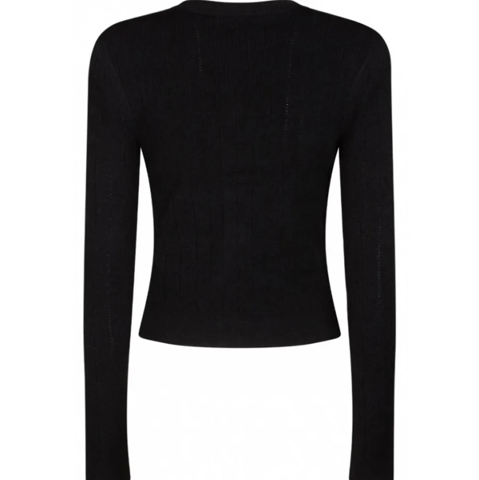 Balmain Black Cropped Cardigan. Black knitted construction cardigan, faux pocket detail, embossed gold tone buttons. Ribbed trim, V neck, front press stud fastening, shoulder pads, long sleeves, straight hem and cropped.