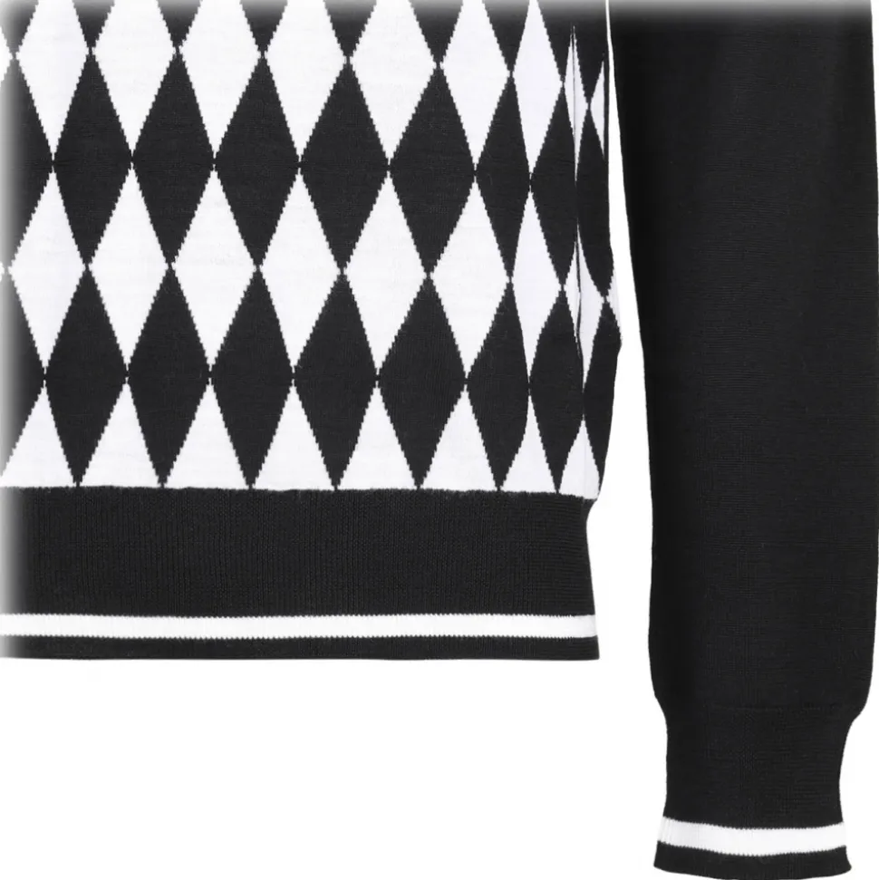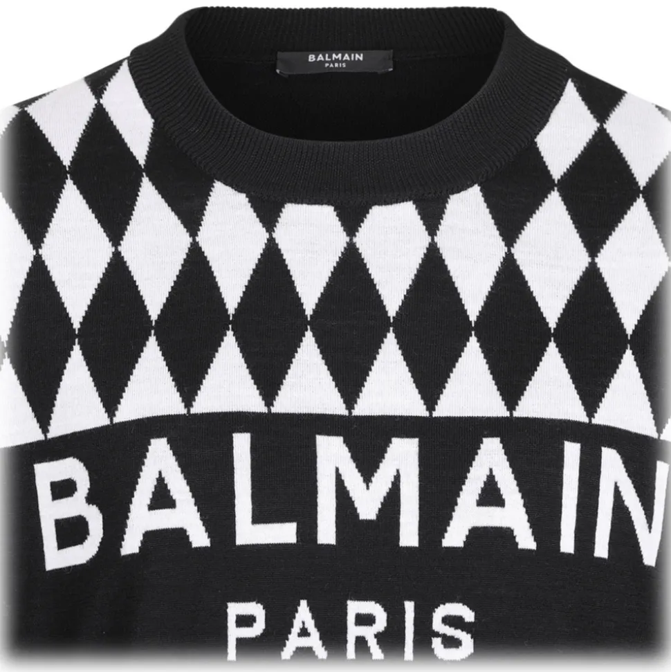 Balmain Black Diamond Jacquard Jumper. Black wool jumper, knitted construction, jacquard, diamond pattern, intarsia-knit logo. Striped edge ribbed cuffs and hem, round neck, long sleeves, straight hem.