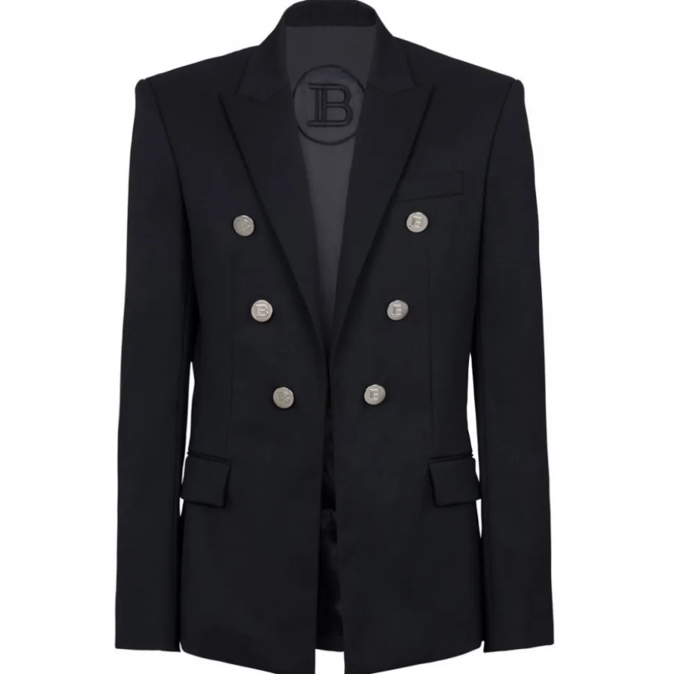 Balmain Black Double-Breasted Wool Blazer. Black wool blazer with logo embossed silver buttons, double-breasted button fastening, two patch pockets on front, one reglan breast pocket.