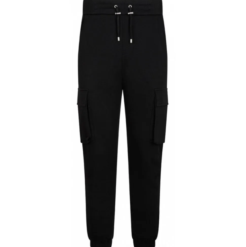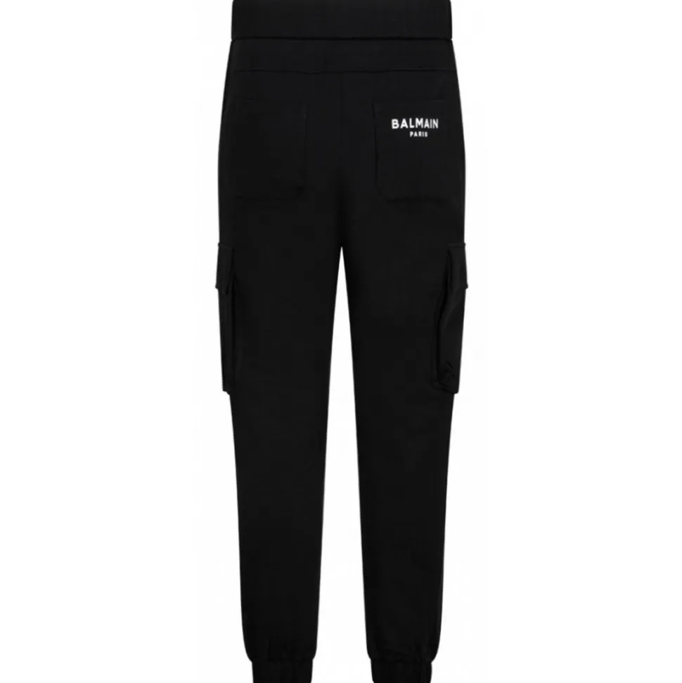 Balmain Black Jogging Bottoms. Black two cargo pockets jogging, contrasting Balmain Paris logo printed at the back, elastic waistband. Drawstring adjustable waist, silver metal eyelets, stoppers and aglets, ribbed trim.
