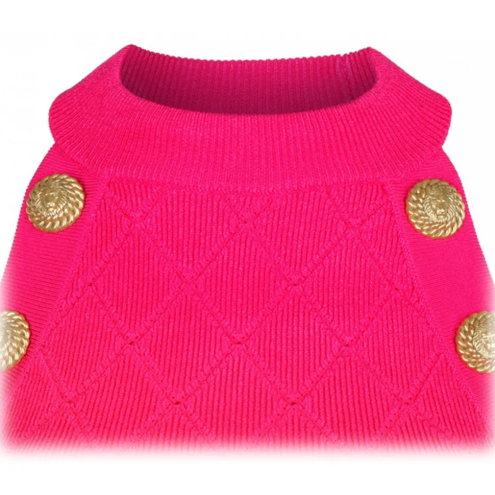 Balmain Fuchsia Knitted Vest. Fuchsia knitted vest, round neckline, American style armholes. Six decorative ” Icon Lion ” buttons in golden metal.