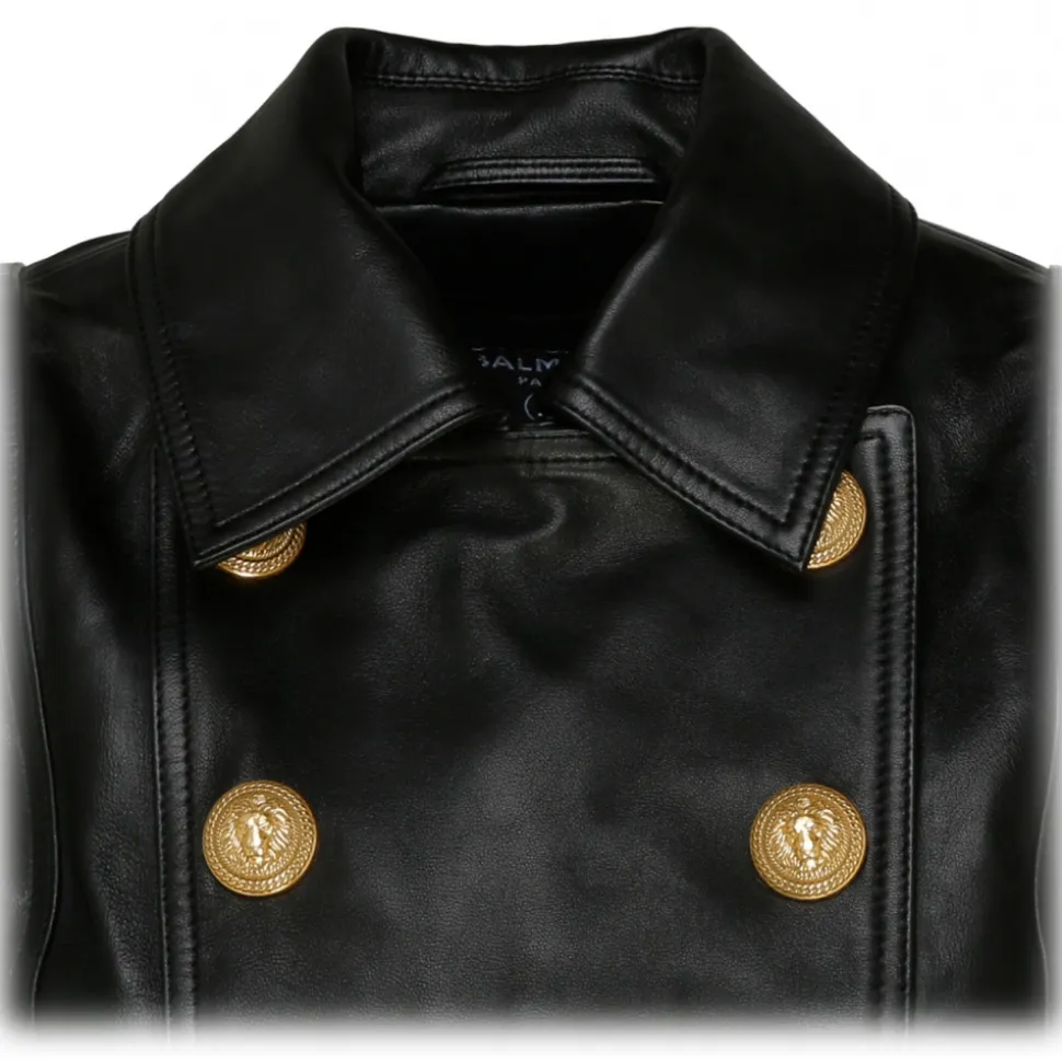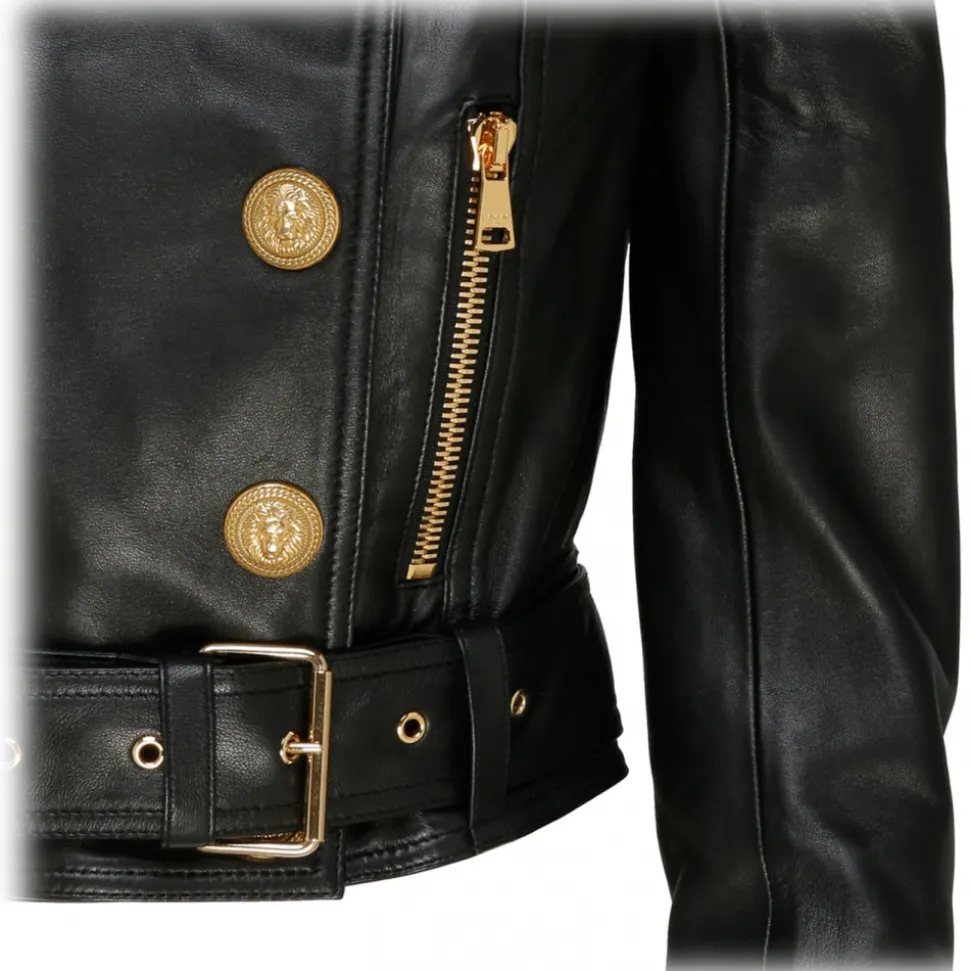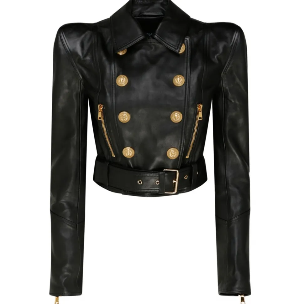 Balmain Black Leather Perfecto Cropped Jacket. Black leather jacket, classic collar, shoulder pads, embossed gold tone buttons, double breasted button fastening, two side zip fastening pockets, long sleeves, cuff zipps, buckle fastening, cropped.