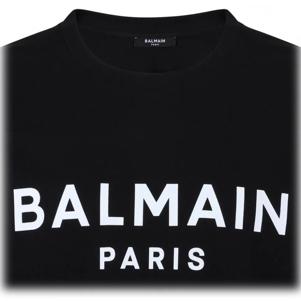Balmain Black Logo Print T-Shirt. Black cotton t-shirt, jersey texture, logo print to the front, crew neck. Long sleeves, straight hem, unlined.