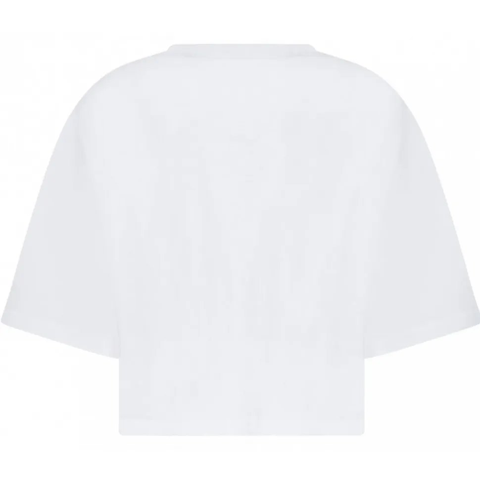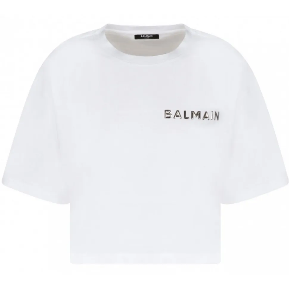Balmain White Logo Print T-Shirt. White cotton t-shirt, cropped, round neck with ribbed trim, short sleeves, contrasting Balmain logo printed on the front.