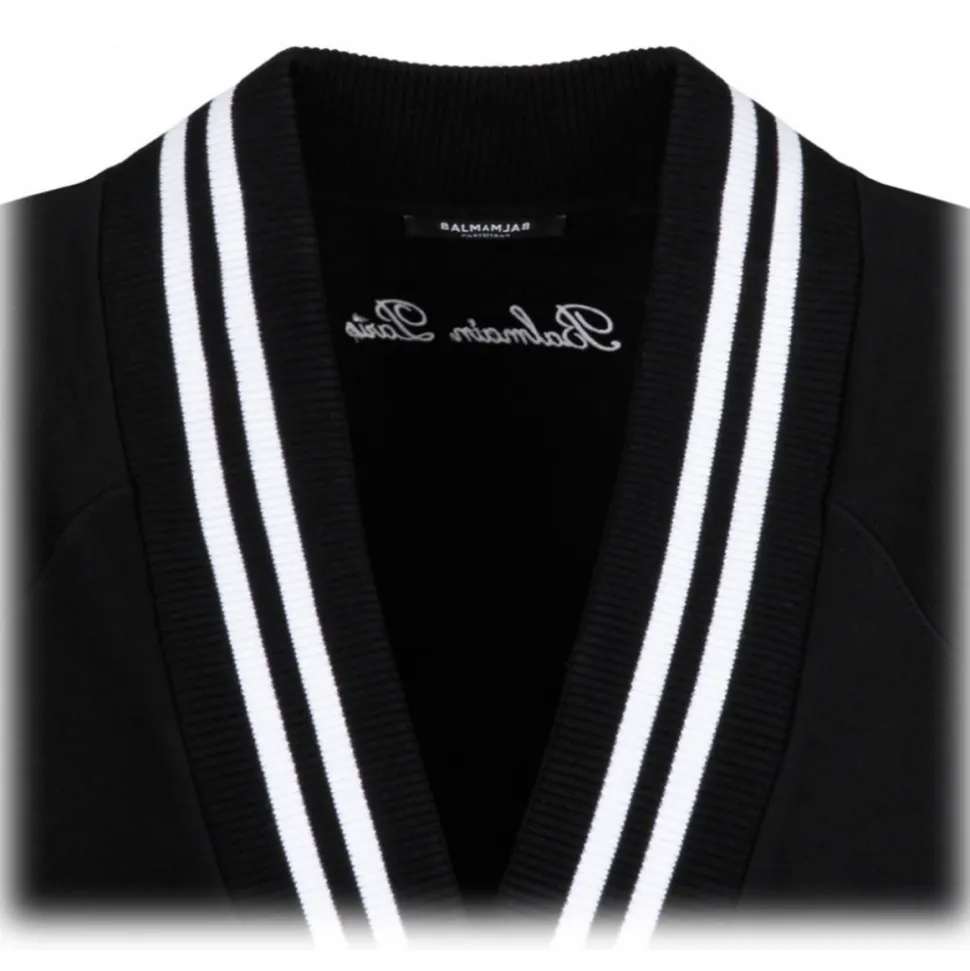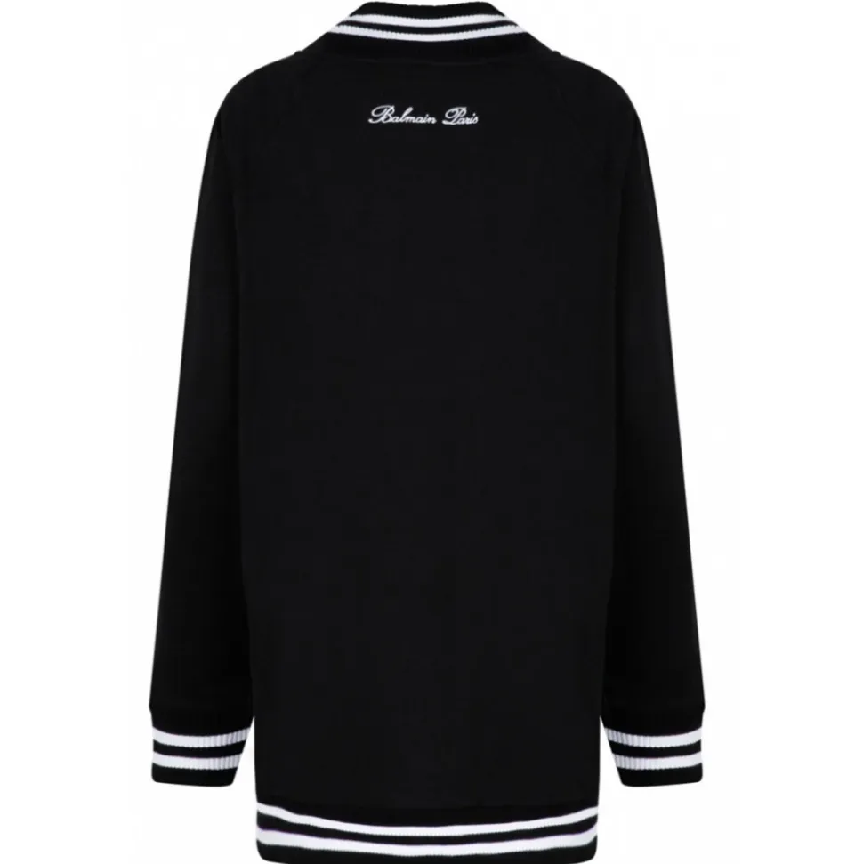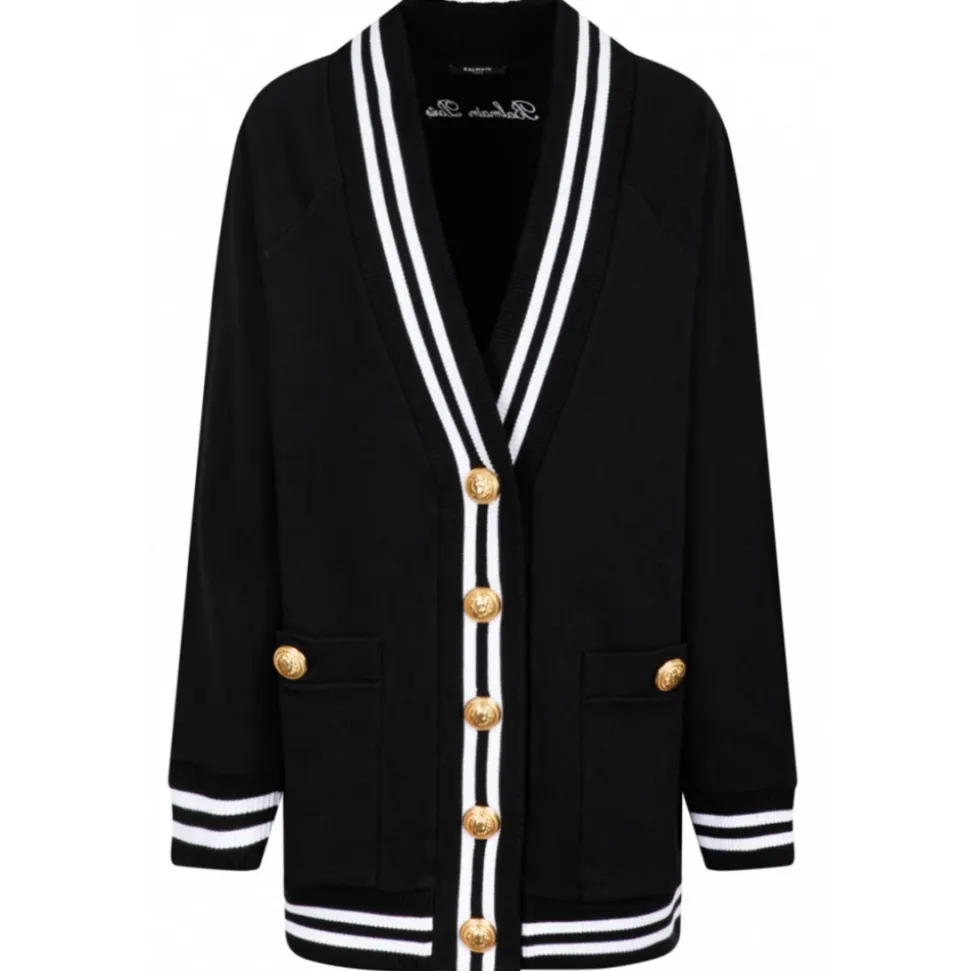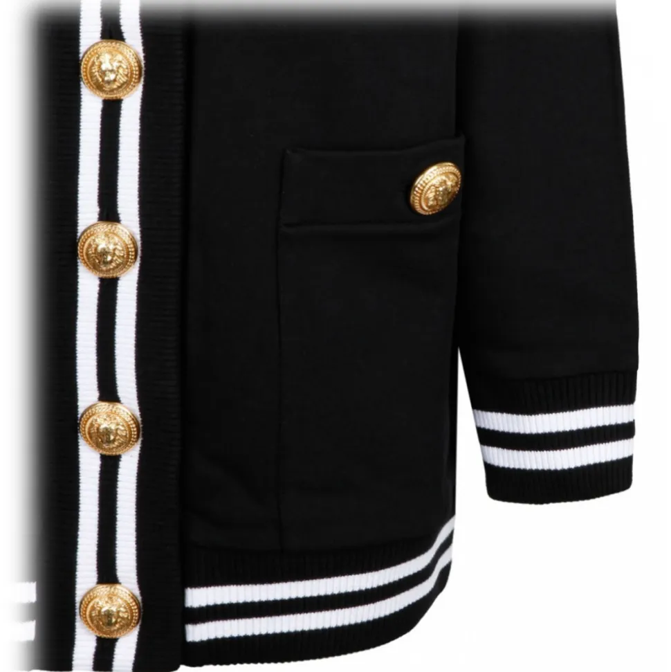 Balmain Black Long Cardigan. Black cotton fleece long cardigan, front button closure, five Iconic Lion buttons in gold metal, V neck with contrasting striped pattern. Long sleeves, raglan shoulders, iconic contrasting Balmain logo embroidered on the back.