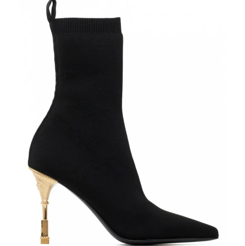 Balmain Black Moneta Knitted Ankle Boots. Black knitted ankle boots, stretch design, pointed toe, pull tab at the heel, branded insole, gold tone hardware, Moneta engraved heel.