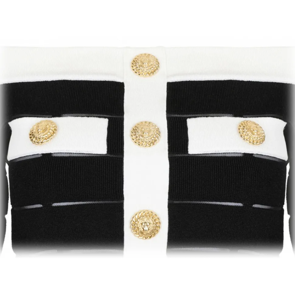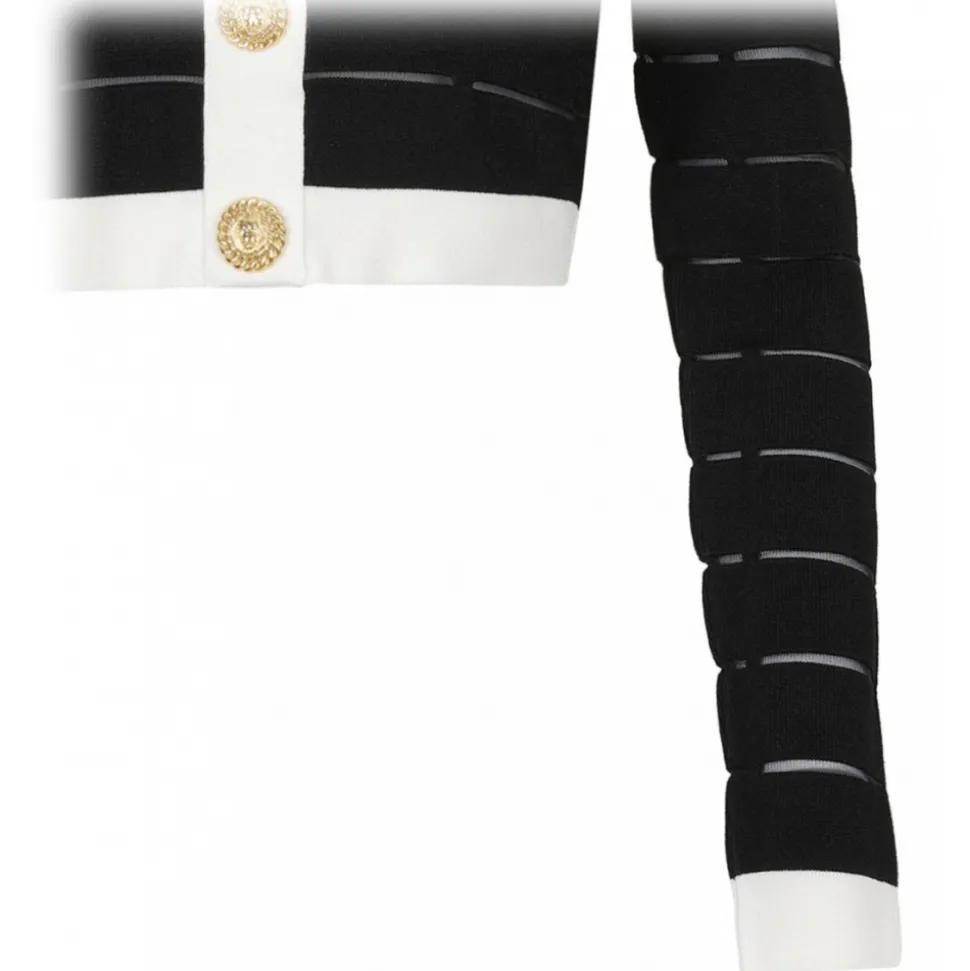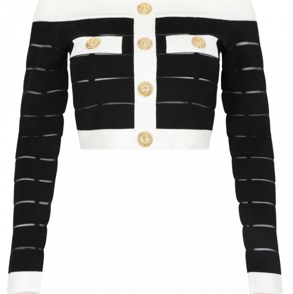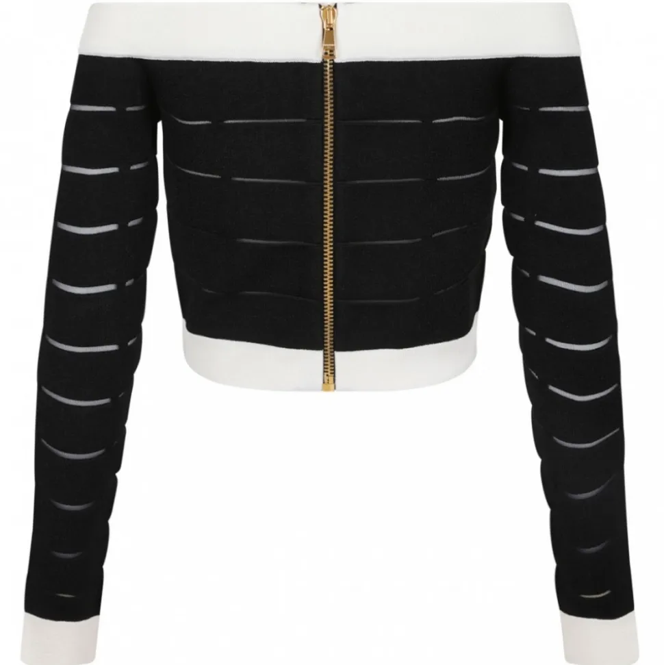 Balmain Off Shoulder Top. Black and white knitted construction top, openwork areas, contrasting trim. Decorative button detailing, off-shoulder, rear zip fastening. Long sleeves, cropped and straight hem.