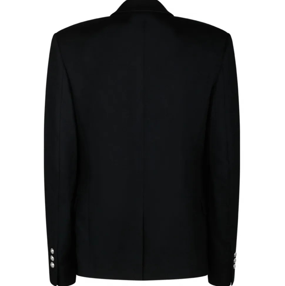 Balmain Black Open Front Blazer. Black virgin wool cashmere blend blazer, open front, logo embossed buttons, peak lapels. Two front flap pockets, chest welt pocket, long sleeves, buttoned cuffs sleeves, English rear vents and straight hem.
