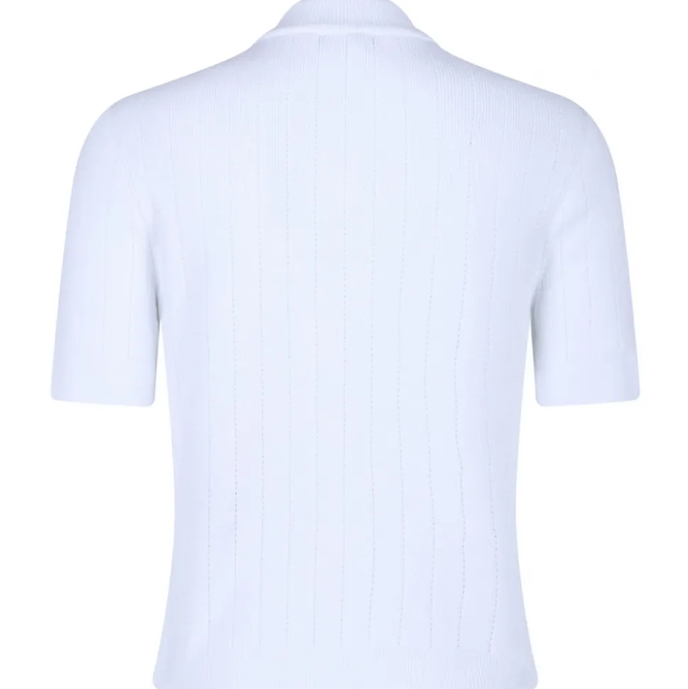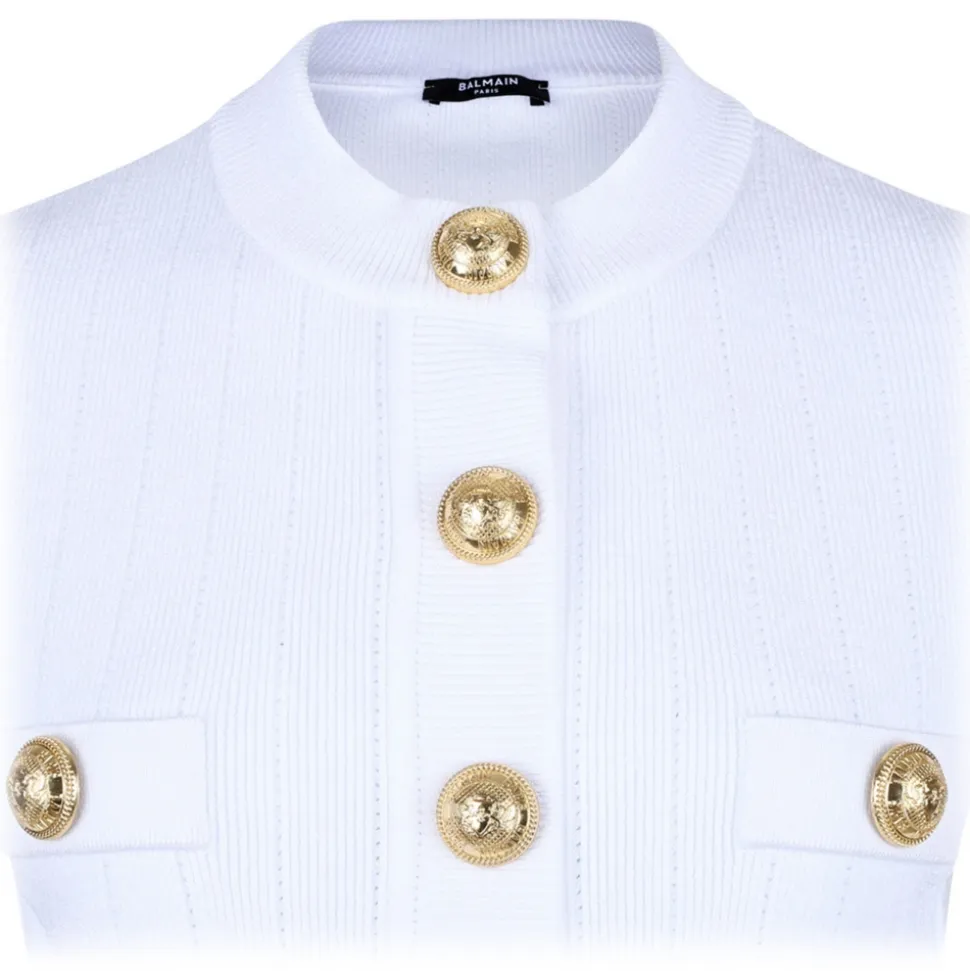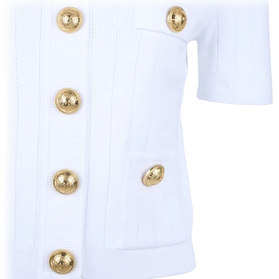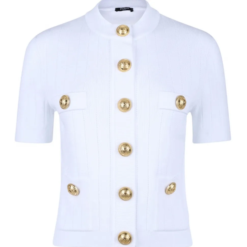 Balmain White Pointelle Knit Cardigan. White pointelle knit cardigan, embossed gold-tone buttons, four front patch pockets. Round neck, short sleeves and straight hem.