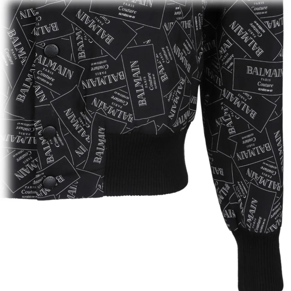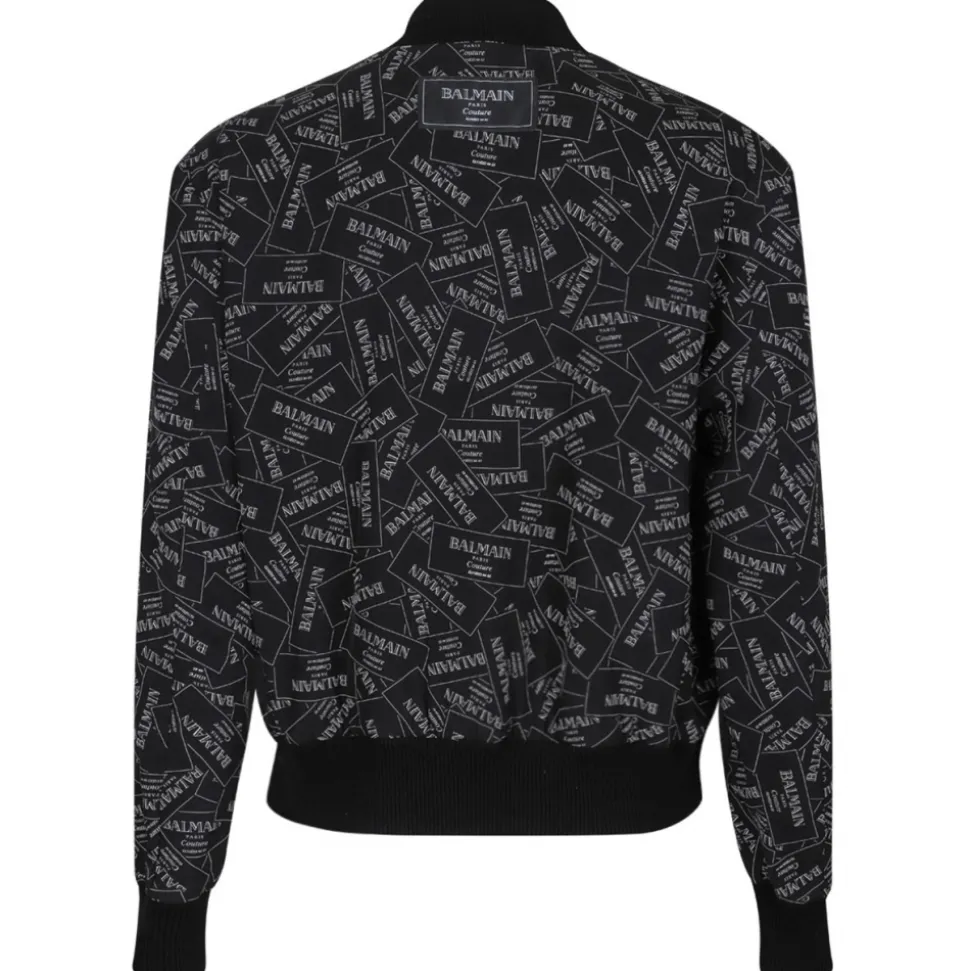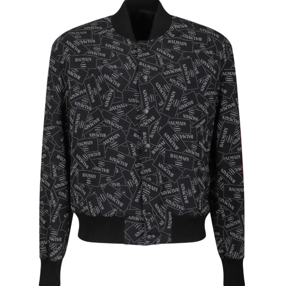 Balmain Printed Bomber Jacket. Black and white bomber jacket, all-over logo print, front press-stud fastening. Ribbed band collar, long sleeves, two press-stud fastening side pockets, ribbed cuffs and hem.