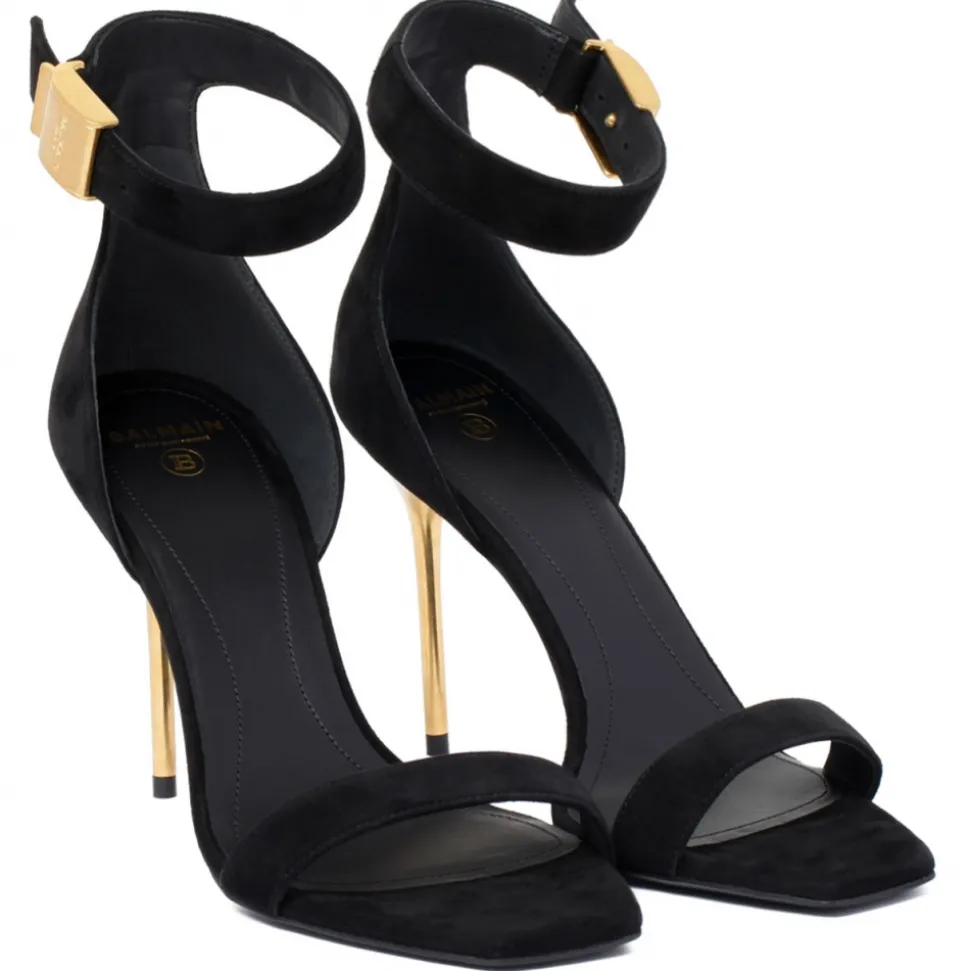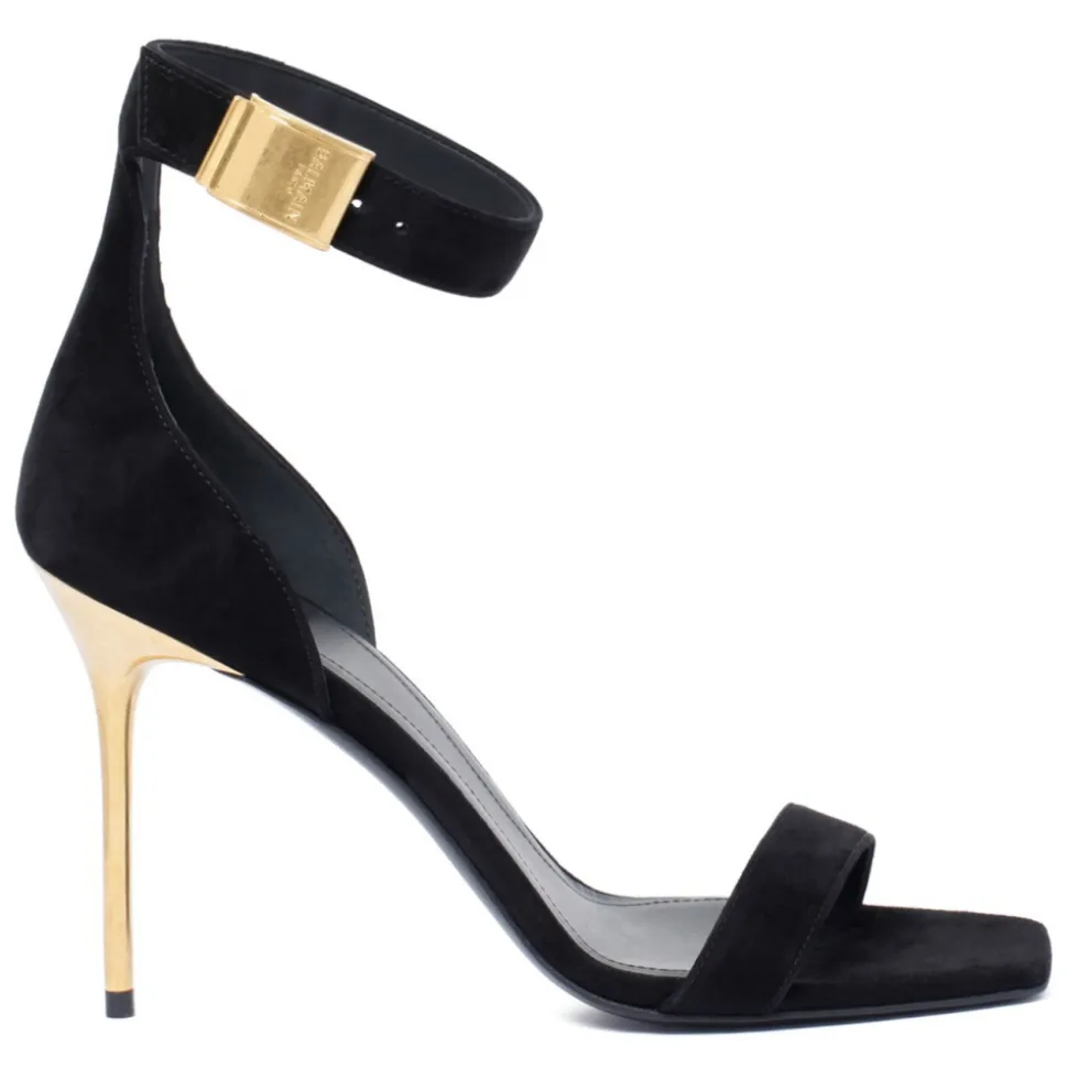 Balmain Pumps Black And Gold, gold-tone stiletto heel, Adjustable ankle strap with Balmain logo fastening in burnished gold finish, Open square toe.