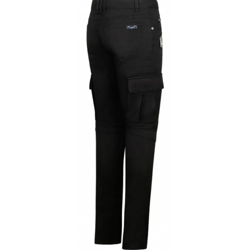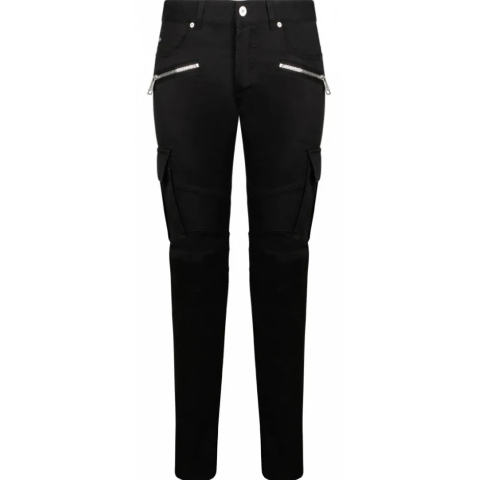 Balmain Black Skinny Leg Trousers. Black cotton blend trousers, zip detail, concealed fly and button fastening, classic five pockets, skinny cut, two side flap pockets, belt loops, straight hem.