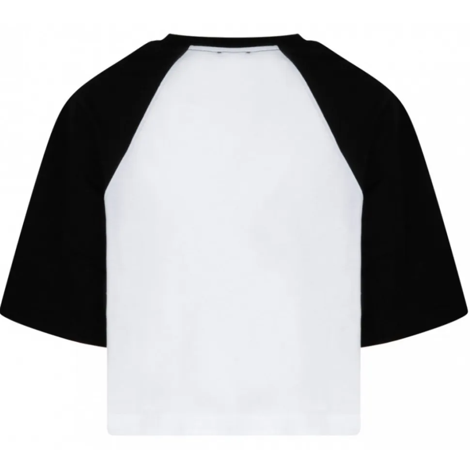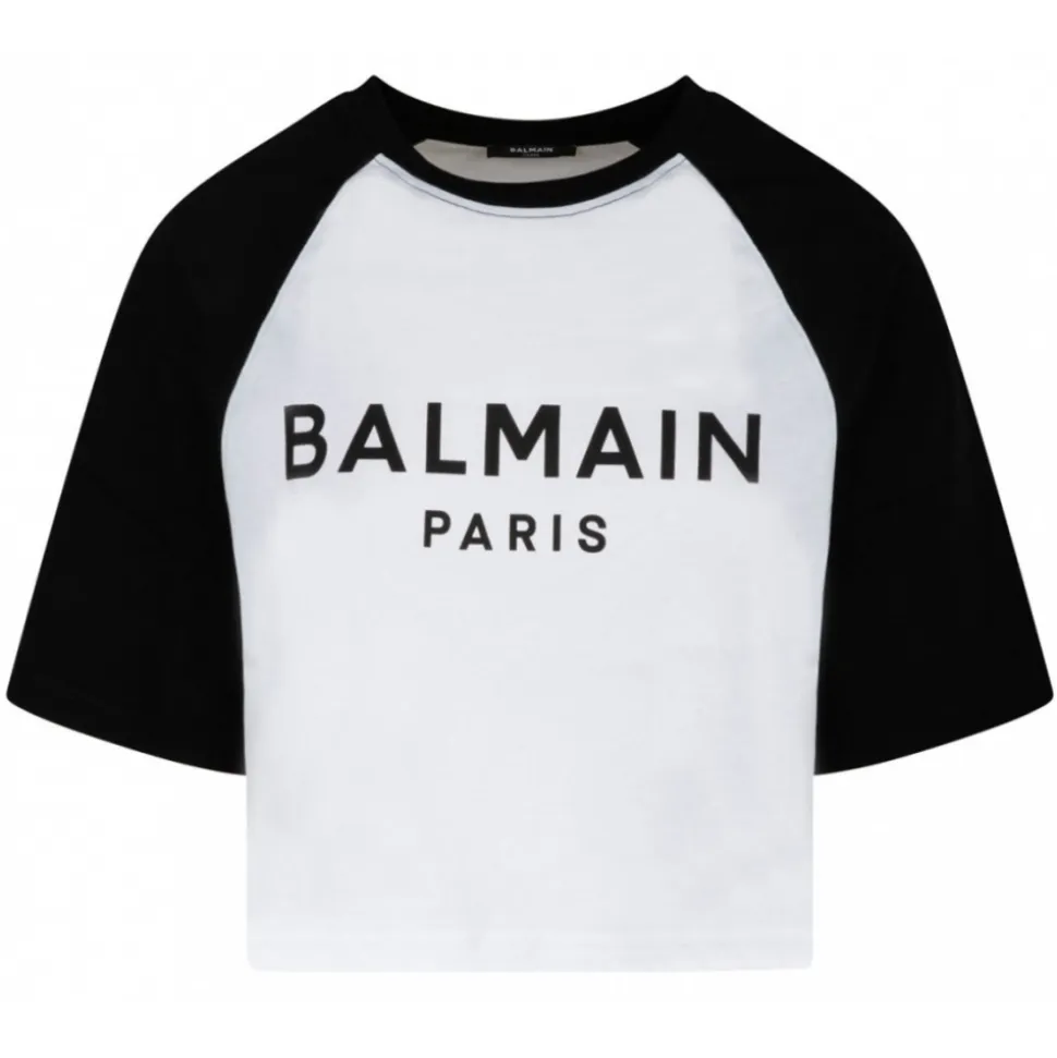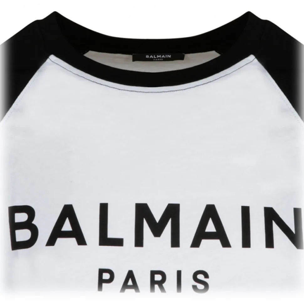 Balmain Black and White T-Shirt. Black and white cotton t-shirt, contrasting Balmain Paris logo print on the front, short cut, round neck, plain contrasting reglan sleeves.
