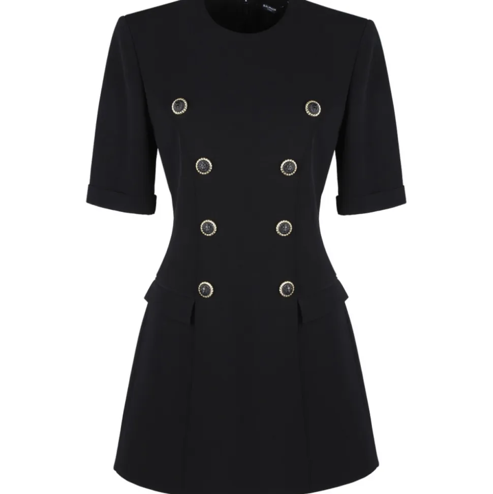 Balmain Black Tailored Minidress. Black textured finish minidress, tailored design, decorative button detailing, round neck. Concealed rear zip fastening, shoulder pads, short sleeves, turn-up cuffs, fitted waistline. Straight hem, thigh-length, two front flap pockets, full lining.