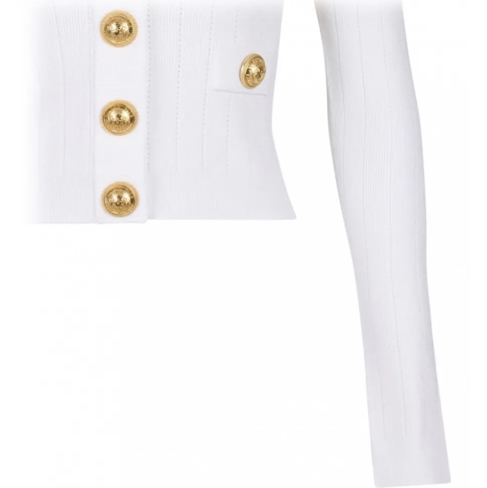 Balmain White V Neck Cardigan. White knitted construction cardigan, embossed gold-tone buttons plunging, V-neck, front button fastening. Shoulder pads, long sleeves, two front patch pockets, ribbed trim and straight hem.