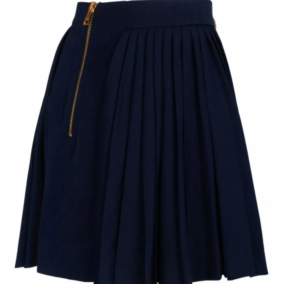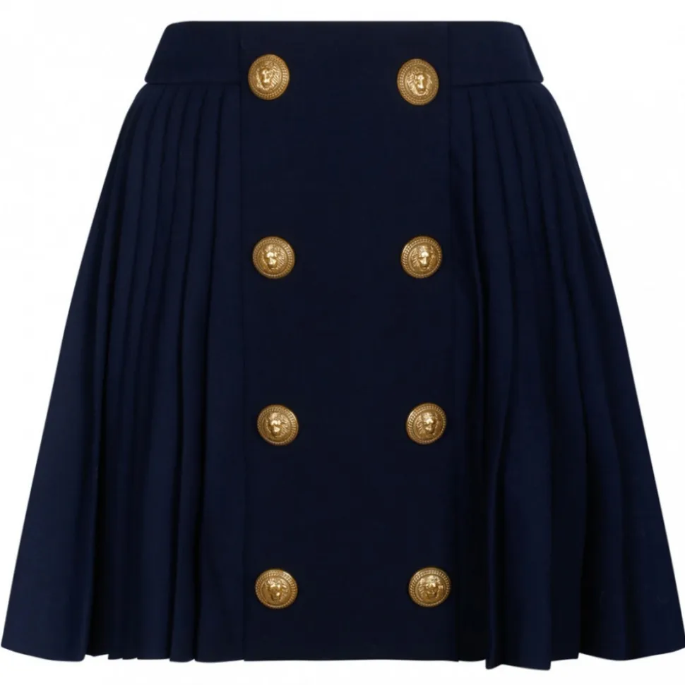Balmain Navy Blue Wool Pleated Miniskirt. Navy blue wool miniskirt, decorative button detailing, pleat detailing, fitted waistline, rear zip fastening, straight hem.