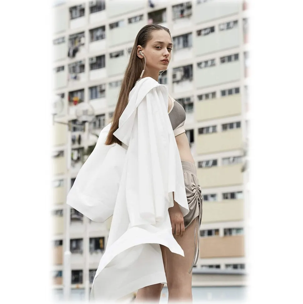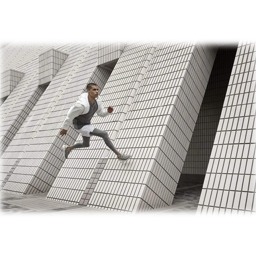 Inspired by the materials used in the production of sneakers, the cord connecting the earbuds is encased in braided textile. The housing of the earphone is made of textured rubber and polymer, designed to resist sweat and moisture as well as wear and tear. The in-line remote comes with aluminium button controls.