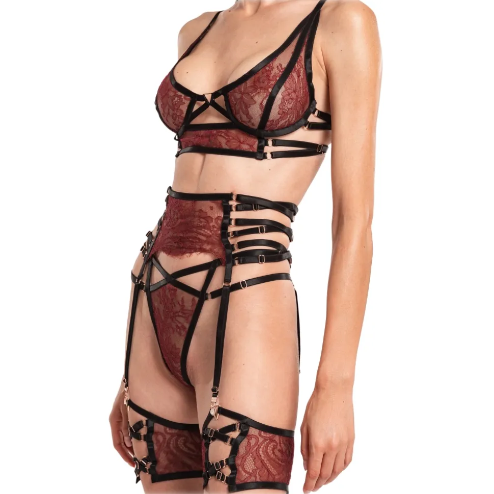 The Buenos Aires’s Bra is a luxurious, dark red fine french lace bra with triangle cup shapes, black playful strings, and rose gold accessories. It enhances body curves and adds a touch of elegance to the wearer’s neckline and shoulders.