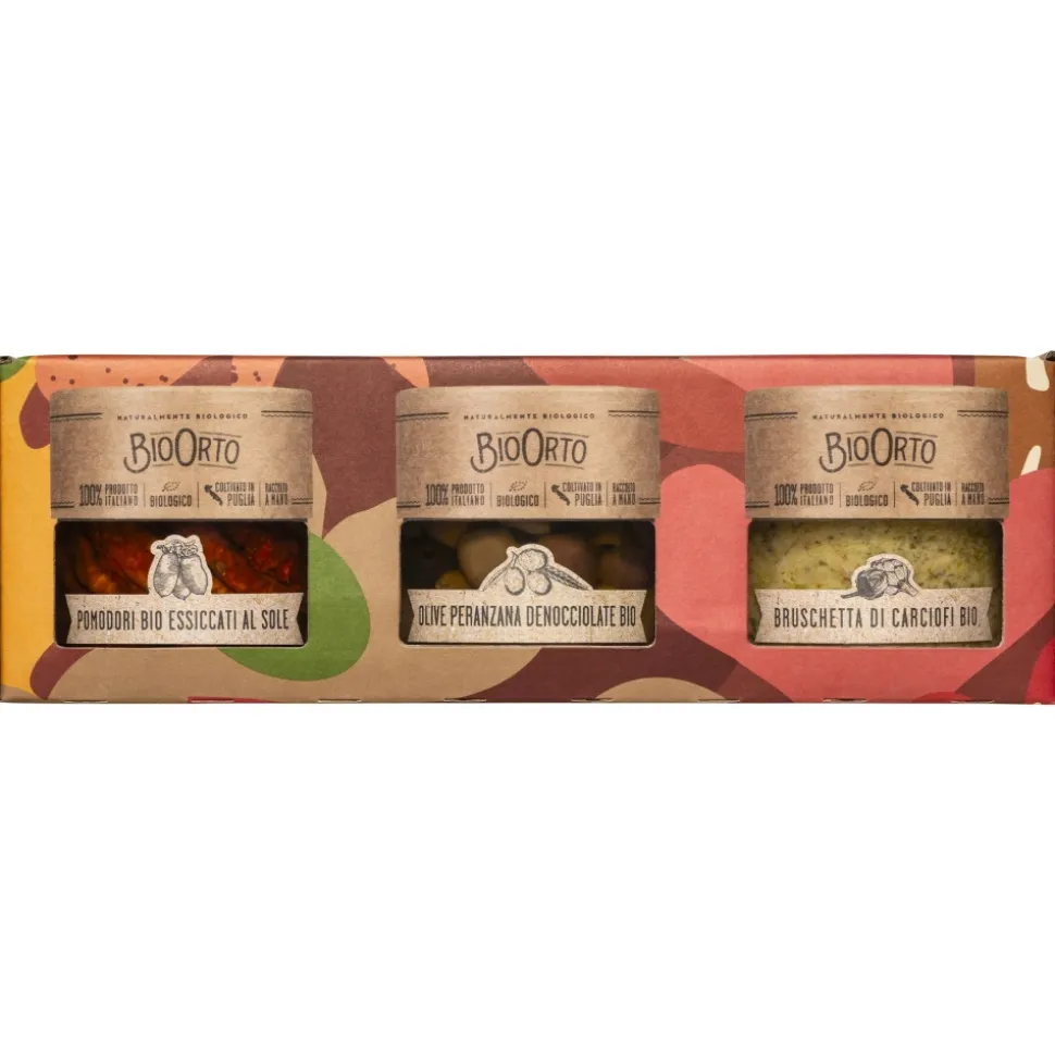 Devised as a gift idea, the Organic Appetizer Trio consists of three organic products that are perfect to share during an appetizer: the Organic Sun-dried Tomatoes in Extra Virgin Olive Oil (200g) for those who look for strong flavours, the new Organic Oil-free Pitted Peranzana Olives (100g), to satisfy the health conscious and nutritional needs of the most demanding customers, and the Organic Artichoke Cream (180g), the condiment that perfectly pairs with everything!